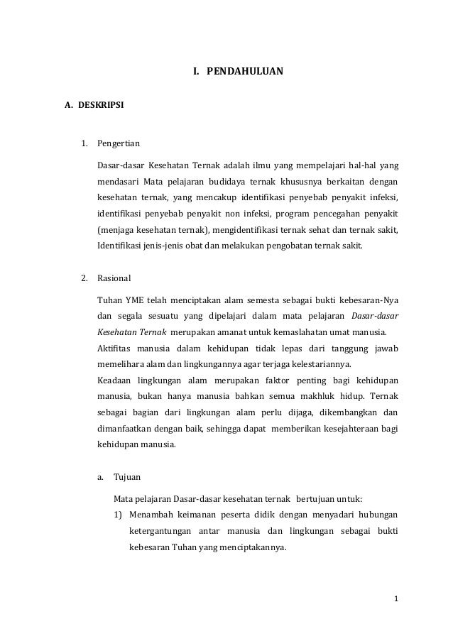 - 1 I. PENDAHULUAN A. DESKRIPSI 1. Pengertian Dasar-dasar Kesehatan Ternak adalah ilmu yang mempelajari hal-hal yang mendasari Mata pelajaran budidaya ternak khususnya berkaitan dengan kesehatan ternak, yang mencakup identifikasi penyebab penyakit infeksi, identifikasi penyebab penyakit non infeksi, program pencegahan penyakit (menjaga kesehatan ternak), mengidentifikasi ternak sehat dan ternak sakit, Identifikasi jenis-jenis obat dan melakukan pengobatan ternak sakit. 2. Rasional Tuhan YME telah menciptakan alam semesta sebagai bukti kebesaran-Nya dan segala sesuatu yang dipelajari dalam mata pelajaran Dasar-dasar Kesehatan Ternak merupakan amanat untuk kemaslahatan umat manusia. Aktifitas manusia dalam kehidupan tidak lepas dari tanggung jawab memelihara alam dan lingkungannya agar terjaga kelestariannya. Keadaan lingkungan alam merupakan faktor penting bagi kehidupan manusia, bukan hanya manusia bahkan semua makhluk hidup. Ternak sebagai bagian dari lingkungan alam perlu dijaga, dikembangkan dan dimanfaatkan dengan baik, sehingga dapat memberikan kesejahteraan bagi kehidupan manusia. a. Tujuan Mata pelajaran Dasar-dasar kesehatan ternak bertujuan untuk: 1) Menambah keimanan peserta didik dengan menyadari hubungan ketergantungan antar manusia dan lingkungan sebagai bukti kebesaran Tuhan yang menciptakannya.