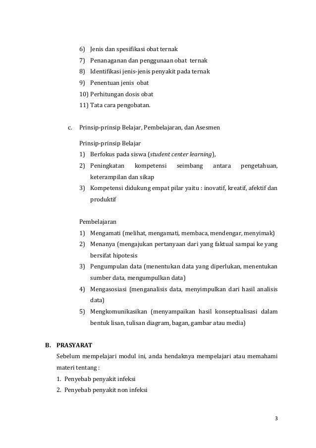 - 12. 3 6) Jenis dan spesifikasi obat ternak 7) Penanaganan dan penggunaan obat ternak 8) Identifikasi jenis-jenis penyakit pada ternak 9) Penentuan jenis obat 10) Perhitungan dosis obat 11) Tata cara pengobatan. c. Prinsip-prinsip Belajar, Pembelajaran, dan Asesmen Prinsip-prinsip Belajar 1) Berfokus pada siswa (student center learning), 2) Peningkatan kompetensi seimbang antara pengetahuan, keterampilan dan sikap 3) Kompetensi didukung empat pilar yaitu : inovatif, kreatif, afektif dan produktif Pembelajaran 1) Mengamati (melihat, mengamati, membaca, mendengar, menyimak) 2) Menanya (mengajukan pertanyaan dari yang faktual sampai ke yang bersifat hipotesis 3) Pengumpulan data (menentukan data yang diperlukan, menentukan sumber data, mengumpulkan data) 4) Mengasosiasi (menganalisis data, menyimpulkan dari hasil analisis data) 5) Mengkomunikasikan (menyampaikan hasil konseptualisasi dalam bentuk lisan, tulisan diagram, bagan, gambar atau media) B. PRASYARAT Sebelum mempelajari modul ini, anda hendaknya mempelajari atau memahami materi tentang : 1. Penyebab penyakit infeksi 2. Penyebab penyakit non infeksi