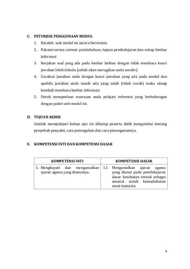 - 13. 4 C. PETUNJUK PENGGUNAAN MODUL 1. Bacalah unit modul ini secara berurutan 2. Pahami secara cermat: pendahuluan, tujuan pembelajaran dan setiap lembar informasi 3. Kerjakan soal yang ada pada lembar latihan dengan tidak membaca kunci jawaban lebih dahulu (sebab akan merugikan anda sendiri) 4. Cocokan jawaban anda dengan kunci jawaban yang ada pada modul dan apabila jawaban anda masih ada yang salah (tidak cocok) maka ulangi kembali membaca lembar informasi. 5. Untuk memperluas wawasan anda pelajari referensi yang berhubungan dengan paket unit modul ini. D. TUJUAN AKHIR Setelah mempelajari bahan ajar ini diharap peserta didik mengetahui tentang penyebab penyakit, cara pencegahan dan cara penanganannya. E. KOMPETENSI INTI DAN KOMPETENSI DASAR KOMPETENSI INTI KOMPETENSI DASAR 1. Menghayati dan mengamalkan ajaran agama yang dianutnya. 1.1 Mengamalkan ajaran agama yang dianut pada pembelajaran dasar kesehatan ternak sebagai amanat untuk kemaslahatan umat manusia.