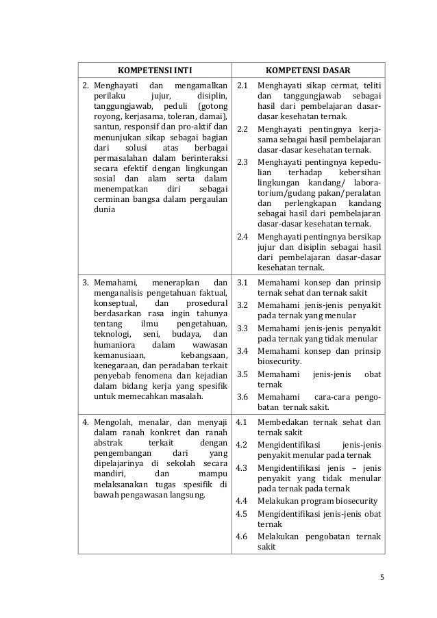 - 14. 5 KOMPETENSI INTI KOMPETENSI DASAR 2. Menghayati dan mengamalkan perilaku jujur, disiplin, tanggungjawab, peduli (gotong royong, kerjasama, toleran, damai), santun, responsif dan pro-aktif dan menunjukan sikap sebagai bagian dari solusi atas berbagai permasalahan dalam berinteraksi secara efektif dengan lingkungan sosial dan alam serta dalam menempatkan diri sebagai cerminan bangsa dalam pergaulan dunia 2.1 Menghayati sikap cermat, teliti dan tanggungjawab sebagai hasil dari pembelajaran dasar- dasar kesehatan ternak. 2.2 Menghayati pentingnya kerja- sama sebagai hasil pembelajaran dasar-dasar kesehatan ternak. 2.3 Menghayati pentingnya kepedu- lian terhadap kebersihan lingkungan kandang/ labora- torium/gudang pakan/peralatan dan perlengkapan kandang sebagai hasil dari pembelajaran dasar-dasar kesehatan ternak. 2.4 Menghayati pentingnya bersikap jujur dan disiplin sebagai hasil dari pembelajaran dasar-dasar kesehatan ternak. 3. Memahami, menerapkan dan menganalisis pengetahuan faktual, konseptual, dan prosedural berdasarkan rasa ingin tahunya tentang ilmu pengetahuan, teknologi, seni, budaya, dan humaniora dalam wawasan kemanusiaan, kebangsaan, kenegaraan, dan peradaban terkait penyebab fenomena dan kejadian dalam bidang kerja yang spesifik untuk memecahkan masalah. 3.1 Memahami konsep dan prinsip ternak sehat dan ternak sakit 3.2 Memahami jenis-jenis penyakit pada ternak yang menular 3.3 Memahami jenis-jenis penyakit pada ternak yang tidak menular 3.4 Memahami konsep dan prinsip biosecurity. 3.5 Memahami jenis-jenis obat ternak 3.6 Memahami cara-cara pengo- batan ternak sakit. 4. Mengolah, menalar, dan menyaji dalam ranah konkret dan ranah abstrak terkait dengan pengembangan dari yang dipelajarinya di sekolah secara mandiri, dan mampu melaksanakan tugas spesifik di bawah pengawasan langsung. 4.1 Membedakan ternak sehat dan ternak sakit 4.2 Mengidentifikasi jenis-jenis penyakit menular pada ternak 4.3 Mengidentifikasi jenis – jenis penyakit yang tidak menular pada ternak pada ternak 4.4 Melakukan program biosecurity 4.5 Mengidentifikasi jenis-jenis obat ternak 4.6 Melakukan pengobatan ternak sakit