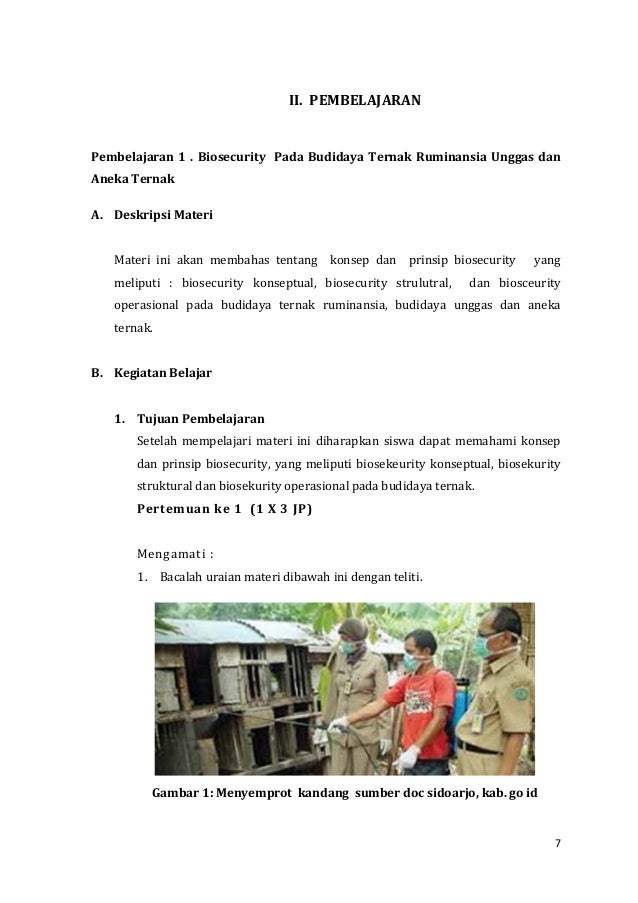 - 16. 7 II. PEMBELAJARAN Pembelajaran 1 . Biosecurity Pada Budidaya Ternak Ruminansia Unggas dan Aneka Ternak A. Deskripsi Materi Materi ini akan membahas tentang konsep dan prinsip biosecurity yang meliputi : biosecurity konseptual, biosecurity strulutral, dan biosceurity operasional pada budidaya ternak ruminansia, budidaya unggas dan aneka ternak. B. Kegiatan Belajar 1. Tujuan Pembelajaran Setelah mempelajari materi ini diharapkan siswa dapat memahami konsep dan prinsip biosecurity, yang meliputi biosekeurity konseptual, biosekurity struktural dan biosekurity operasional pada budidaya ternak. Pertemuan ke 1 (1 X 3 JP) Mengamati : 1. Bacalah uraian materi dibawah ini dengan teliti. Gambar 1: Menyemprot kandang sumber doc sidoarjo, kab. go id