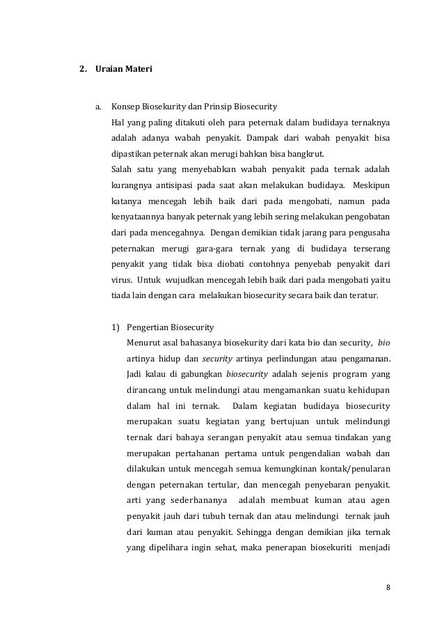 - 17. 8 2. Uraian Materi a. Konsep Biosekurity dan Prinsip Biosecurity Hal yang paling ditakuti oleh para peternak dalam budidaya ternaknya adalah adanya wabah penyakit. Dampak dari wabah penyakit bisa dipastikan peternak akan merugi bahkan bisa bangkrut. Salah satu yang menyebabkan wabah penyakit pada ternak adalah kurangnya antisipasi pada saat akan melakukan budidaya. Meskipun katanya mencegah lebih baik dari pada mengobati, namun pada kenyataannya banyak peternak yang lebih sering melakukan pengobatan dari pada mencegahnya. Dengan demikian tidak jarang para pengusaha peternakan merugi gara-gara ternak yang di budidaya terserang penyakit yang tidak bisa diobati contohnya penyebab penyakit dari virus. Untuk wujudkan mencegah lebih baik dari pada mengobati yaitu tiada lain dengan cara melakukan biosecurity secara baik dan teratur. 1) Pengertian Biosecurity Menurut asal bahasanya biosekurity dari kata bio dan security, bio artinya hidup dan security artinya perlindungan atau pengamanan. Jadi kalau di gabungkan biosecurity adalah sejenis program yang dirancang untuk melindungi atau mengamankan suatu kehidupan dalam hal ini ternak. Dalam kegiatan budidaya biosecurity merupakan suatu kegiatan yang bertujuan untuk melindungi ternak dari bahaya serangan penyakit atau semua tindakan yang merupakan pertahanan pertama untuk pengendalian wabah dan dilakukan untuk mencegah semua kemungkinan kontak/penularan dengan peternakan tertular, dan mencegah penyebaran penyakit. arti yang sederhananya adalah membuat kuman atau agen penyakit jauh dari tubuh ternak dan atau melindungi ternak jauh dari kuman atau penyakit. Sehingga dengan demikian jika ternak yang dipelihara ingin sehat, maka penerapan biosekuriti menjadi
