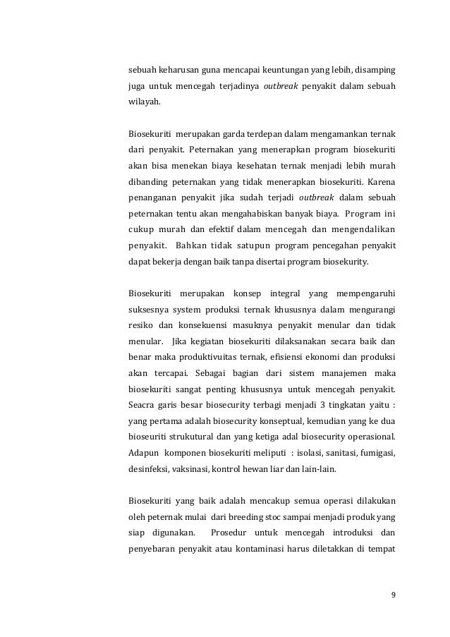 - 18. 9 sebuah keharusan guna mencapai keuntungan yang lebih, disamping juga untuk mencegah terjadinya outbreak penyakit dalam sebuah wilayah. Biosekuriti merupakan garda terdepan dalam mengamankan ternak dari penyakit. Peternakan yang menerapkan program biosekuriti akan bisa menekan biaya kesehatan ternak menjadi lebih murah dibanding peternakan yang tidak menerapkan biosekuriti. Karena penanganan penyakit jika sudah terjadi outbreak dalam sebuah peternakan tentu akan mengahabiskan banyak biaya. Program ini cukup murah dan efektif dalam mencegah dan mengendalikan penyakit. Bahkan tidak satupun program pencegahan penyakit dapat bekerja dengan baik tanpa disertai program biosekurity. Biosekuriti merupakan konsep integral yang mempengaruhi suksesnya system produksi ternak khususnya dalam mengurangi resiko dan konsekuensi masuknya penyakit menular dan tidak menular. Jika kegiatan biosekuriti dilaksanakan secara baik dan benar maka produktivuitas ternak, efisiensi ekonomi dan produksi akan tercapai. Sebagai bagian dari sistem manajemen maka biosekuriti sangat penting khususnya untuk mencegah penyakit. Seacra garis besar biosecurity terbagi menjadi 3 tingkatan yaitu : yang pertama adalah biosecurity konseptual, kemudian yang ke dua bioseuriti strukutural dan yang ketiga adal biosecurity operasional. Adapun komponen biosekuriti meliputi : isolasi, sanitasi, fumigasi, desinfeksi, vaksinasi, kontrol hewan liar dan lain-lain. Biosekuriti yang baik adalah mencakup semua operasi dilakukan oleh peternak mulai dari breeding stoc sampai menjadi produk yang siap digunakan. Prosedur untuk mencegah introduksi dan penyebaran penyakit atau kontaminasi harus diletakkan di tempat