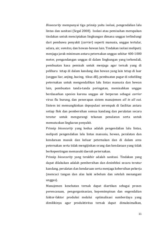 - 20. 11 Biosecurity mempunyai tiga prinsip yaitu isolasi, pengendalian lalu lintas dan sanitasi (Segal 2008). Isolasi atau pemisahan merupakan tindakan untuk menciptakan lingkungan dimana unggas terlindungi dari pembawa penyakit (carrier) seperti manusia, unggas tertular, udara, air, vomites, dan hewan-hewan lain. Tindakan isolasi meliputi; menjaga jarak minimum antara peternakan unggas sekitar 400-1000 meter, pengandangan unggas di dalam lingkungan yang terkendali, pembuatan kasa pemisah untuk menjaga agar ternak yang di pelihara tetap di dalam kandang dan hewan yang lain tetap di luar (unggas liar, anjing, kucing, tikus dll), pembuatan pagar di sekeliling peternakan untuk mengendalikan lalu lintas manusia dan hewan lain, pembuatan tanda-tanda peringatan, memisahkan unggas berdasarkan spesies karena unggas air berperan sebagai carrier virus flu burung, dan penerapan sistem manajemen all in all out. Sistem ini memungkinkan depopulasi serempak di fasilitas antara setiap flok dan pembersihan semua kandang dan peralatan secara teratur untuk mengurangi tekanan penularan serta untuk memutuskan lingkaran penyakit. Prinsip biosecurity yang kedua adalah pengendalian lalu lintas, meliputi pengendalian lalu lintas manusia, hewan, peralatan dan kendaraan masuk dan keluar peternakan dan di dalam area peternakan serta tidak mengijinkan orang dan kendaraan yang tidak berkepentingan memasuki daerah peternakan. Prinsip biosecurity yang terakhir adalah sanitasi. Tindakan yang dapat dilakukan adalah pembersihan dan desinfeksi secara teratur kandang, peralatan dan kendaraan serta menjaga kebersihan pekerja (mencuci tangan dan alas kaki sebelum dan setelah menangani unggas). Manajemen kesehatan ternak dapat diartikan sebagai proses perencanaan, pengorganisasian, kepemimpinan dan engendalian faktor-faktor produksi melalui optimalisasi sumberdaya yang dimilikinya agar produktivitas ternak dapat dimaksimalkan,