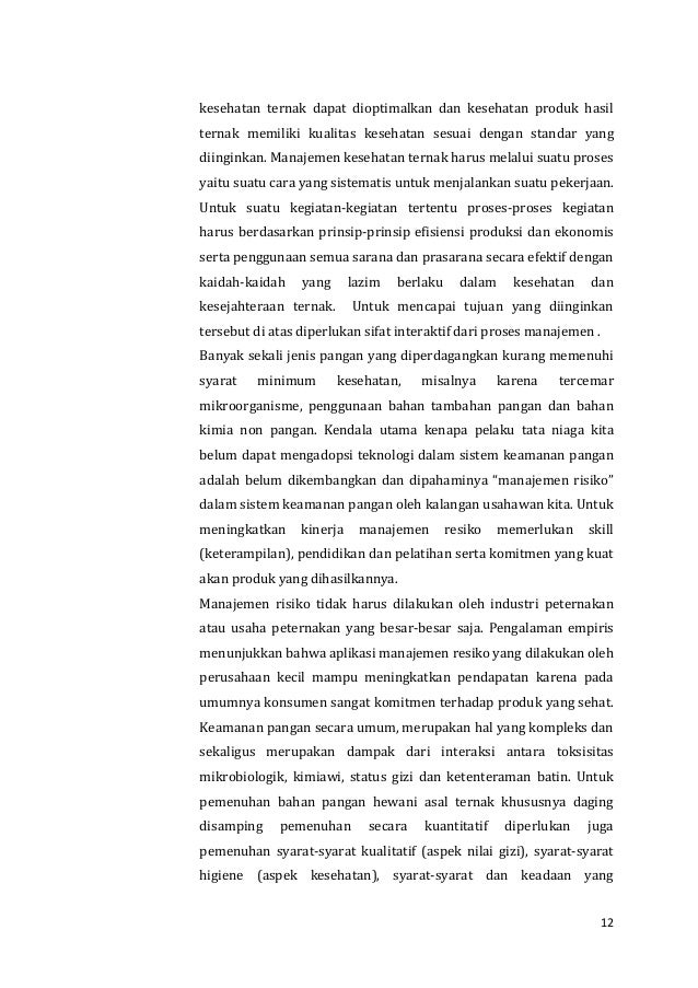 - 21. 12 kesehatan ternak dapat dioptimalkan dan kesehatan produk hasil ternak memiliki kualitas kesehatan sesuai dengan standar yang diinginkan. Manajemen kesehatan ternak harus melalui suatu proses yaitu suatu cara yang sistematis untuk menjalankan suatu pekerjaan. Untuk suatu kegiatan-kegiatan tertentu proses-proses kegiatan harus berdasarkan prinsip-prinsip efisiensi produksi dan ekonomis serta penggunaan semua sarana dan prasarana secara efektif dengan kaidah-kaidah yang lazim berlaku dalam kesehatan dan kesejahteraan ternak. Untuk mencapai tujuan yang diinginkan tersebut di atas diperlukan sifat interaktif dari proses manajemen . Banyak sekali jenis pangan yang diperdagangkan kurang memenuhi syarat minimum kesehatan, misalnya karena tercemar mikroorganisme, penggunaan bahan tambahan pangan dan bahan kimia non pangan. Kendala utama kenapa pelaku tata niaga kita belum dapat mengadopsi teknologi dalam sistem keamanan pangan adalah belum dikembangkan dan dipahaminya “manajemen risiko” dalam sistem keamanan pangan oleh kalangan usahawan kita. Untuk meningkatkan kinerja manajemen resiko memerlukan skill (keterampilan), pendidikan dan pelatihan serta komitmen yang kuat akan produk yang dihasilkannya. Manajemen risiko tidak harus dilakukan oleh industri peternakan atau usaha peternakan yang besar-besar saja. Pengalaman empiris menunjukkan bahwa aplikasi manajemen resiko yang dilakukan oleh perusahaan kecil mampu meningkatkan pendapatan karena pada umumnya konsumen sangat komitmen terhadap produk yang sehat. Keamanan pangan secara umum, merupakan hal yang kompleks dan sekaligus merupakan dampak dari interaksi antara toksisitas mikrobiologik, kimiawi, status gizi dan ketenteraman batin. Untuk pemenuhan bahan pangan hewani asal ternak khususnya daging disamping pemenuhan secara kuantitatif diperlukan juga pemenuhan syarat-syarat kualitatif (aspek nilai gizi), syarat-syarat higiene (aspek kesehatan), syarat-syarat dan keadaan yang