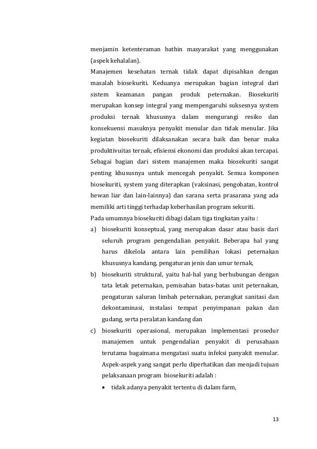 - 22. 13 menjamin ketenteraman bathin masyarakat yang menggunakan (aspek kehalalan). Manajemen kesehatan ternak tidak dapat dipisahkan dengan masalah biosekuriti. Keduanya merupakan bagian integral dari sistem keamanan pangan produk peternakan. Biosekuriti merupakan konsep integral yang mempengaruhi suksesnya system produksi ternak khususnya dalam mengurangi resiko dan konsekuensi masuknya penyakit menular dan tidak menular. Jika kegiatan biosekuriti dilaksanakan secara baik dan benar maka produktivuitas ternak, efisiensi ekonomi dan produksi akan tercapai. Sebagai bagian dari sistem manajemen maka biosekuriti sangat penting khususnya untuk mencegah penyakit. Semua komponen biosekuriti, system yang diterapkan (vaksinasi, pengobatan, kontrol hewan liar dan lain-lainnya) dan sarana serta prasarana yang ada memiliki arti tinggi terhadap keberhasilan program sekuriti. Pada umumnya biosekuriti dibagi dalam tiga tingkatan yaitu : a) biosekuriti konseptual, yang merupakan dasar atau basis dari seluruh program pengendalian penyakit. Beberapa hal yang harus dikelola antara lain pemilihan lokasi peternakan khususnya kandang, pengaturan jenis dan umur ternak, b) biosekuriti struktural, yaitu hal-hal yang berhubungan dengan tata letak peternakan, pemisahan batas-batas unit peternakan, pengaturan saluran limbah peternakan, perangkat sanitasi dan dekontaminasi, instalasi tempat penyimpanan pakan dan gudang, serta peralatan kandang dan c) biosekuriti operasional, merupakan implementasi prosedur manajemen untuk pengendalian penyakit di perusahaan terutama bagaimana mengatasi suatu infeksi panyakit menular. Aspek-aspek yang sangat perlu diperhatikan dan menjadi tujuan pelaksanaan program biosekuriti adalah : tidak adanya penyakit tertentu di dalam farm,