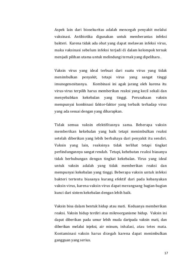 - 26. 17 Aspek lain dari biosekuritas adalah mencegah penyakit melalui vaksinasi. Antibiotika digunakan untuk memberantas infeksi bakteri. Karena tidak ada obat yang dapat melawan infeksi virus, maka vaksinasi sebelum infeksi terjadi di dalam kelompok ternak menjadi pilihan utama untuk melindungi ternak yang dipelihara . Vaksin virus yang ideal terbuat dari suatu virus yang tidak menimbulkan penyakit, tetapi virus yang sangat tinggi imunogenesitasnya. Kombinasi ini agak jarang oleh karena itu virus-virus terpilih harus memberikan reaksi yang kecil sekali dan menyebabkan kekebalan yang tinggi. Perusahaan vaksin mempunyai kombinasi faktor-faktor yang terbaik terhadap virus yang ada sesuai dengan yang diharapkan. Tidak semua vaksin efektifitasnya sama. Beberapa vaksin memberikan kekebalan yang baik tetapi menimbulkan reaksi setelah diberikan yang lebih berbahaya dari penyakit itu sendiri. Vaksin yang lain, reaksinya tidak terlihat tetapi tingkat perlindungannya sangat rendah. Tetapi, kehebatan reaksi biasanya tidak berhubungan dengan tingkat kekebalan. Virus yang ideal untuk vaksin adalah yang tidak memberikan reaksi dan mempunyai kekebalan yang tinggi. Beberapa vaksin untuk infeksi bakteri tertentu biasanya kurang efektif dari pada kebanyakan vaksin virus, karena vaksin virus dapat merangsang bagian-bagian kunci dari sistem kekebalan dengan lebih baik. Vaksin bisa dalam bentuk hidup atau mati. Keduanya memberikan reaksi. Vaksin hidup terdiri atas mikroorganisme hidup. Vaksin ini dapat diberikan pada umur lebih muda daripada vaksin mati, dan diberikan melalui injeksi, air minum, inhalasi, atau tetes mata. Kontaminasi vaksin harus dicegah karena dapat menimbulkan gangguan yang serius.