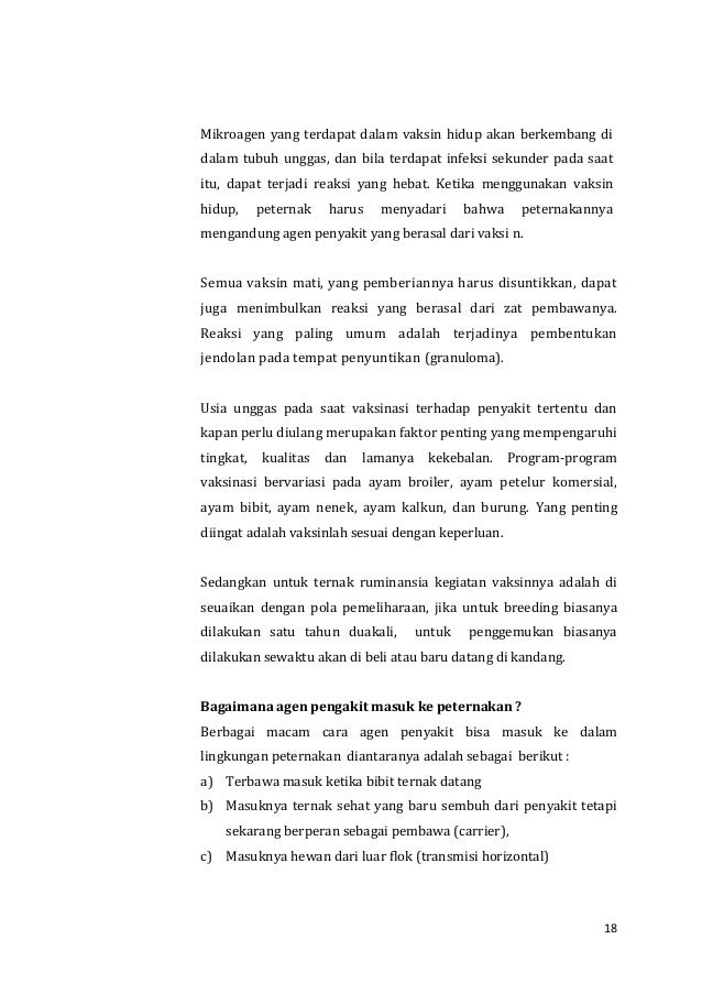 - 27. 18 Mikroagen yang terdapat dalam vaksin hidup akan berkembang di dalam tubuh unggas, dan bila terdapat infeksi sekunder pada saat itu, dapat terjadi reaksi yang hebat. Ketika menggunakan vaksin hidup, peternak harus menyadari bahwa peternakannya mengandung agen penyakit yang berasal dari vaksi n. Semua vaksin mati, yang pemberiannya harus disuntikkan, dapat juga menimbulkan reaksi yang berasal dari zat pembawanya. Reaksi yang paling umum adalah terjadinya pembentukan jendolan pada tempat penyuntikan (granuloma). Usia unggas pada saat vaksinasi terhadap penyakit tertentu dan kapan perlu diulang merupakan faktor penting yang mempengaruhi tingkat, kualitas dan lamanya kekebalan. Program-program vaksinasi bervariasi pada ayam broiler, ayam petelur komersial, ayam bibit, ayam nenek, ayam kalkun, dan burung. Yang penting diingat adalah vaksinlah sesuai dengan keperluan. Sedangkan untuk ternak ruminansia kegiatan vaksinnya adalah di seuaikan dengan pola pemeliharaan, jika untuk breeding biasanya dilakukan satu tahun duakali, untuk penggemukan biasanya dilakukan sewaktu akan di beli atau baru datang di kandang. Bagaimana agen pengakit masuk ke peternakan ? Berbagai macam cara agen penyakit bisa masuk ke dalam lingkungan peternakan diantaranya adalah sebagai berikut : a) Terbawa masuk ketika bibit ternak datang b) Masuknya ternak sehat yang baru sembuh dari penyakit tetapi sekarang berperan sebagai pembawa (carrier), c) Masuknya hewan dari luar flok (transmisi horizontal)