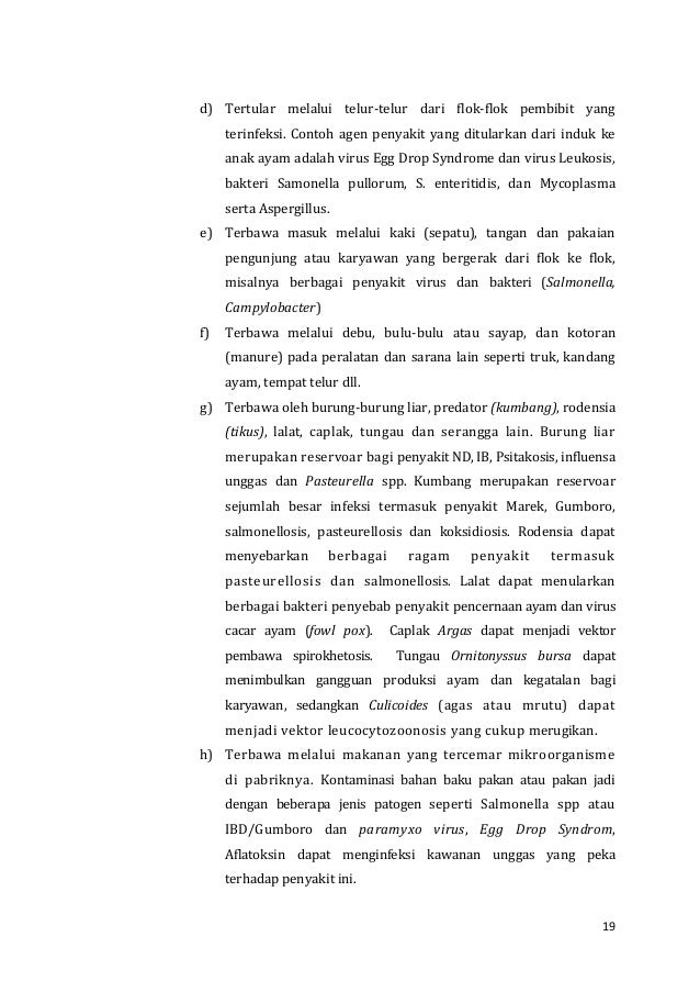 - 28. 19 d) Tertular melalui telur-telur dari flok-flok pembibit yang terinfeksi. Contoh agen penyakit yang ditularkan dari induk ke anak ayam adalah virus Egg Drop Syndrome dan virus Leukosis, bakteri Samonella pullorum, S. enteritidis, dan Mycoplasma serta Aspergillus. e) Terbawa masuk melalui kaki (sepatu), tangan dan pakaian pengunjung atau karyawan yang bergerak dari flok ke flok, misalnya berbagai penyakit virus dan bakteri (Salmonella, Campylobacter) f) Terbawa melalui debu, bulu-bulu atau sayap, dan kotoran (manure) pada peralatan dan sarana lain seperti truk, kandang ayam, tempat telur dll. g) Terbawa oleh burung-burung liar, predator (kumbang), rodensia (tikus), lalat, caplak, tungau dan serangga lain. Burung liar merupakan reservoar bagi penyakit ND, IB, Psitakosis, influensa unggas dan Pasteurella spp. Kumbang merupakan reservoar sejumlah besar infeksi termasuk penyakit Marek, Gumboro, salmonellosis, pasteurellosis dan koksidiosis. Rodensia dapat menyebarkan berbagai ragam penyakit termasuk pasteurellosis dan salmonellosis. Lalat dapat menularkan berbagai bakteri penyebab penyakit pencernaan ayam dan virus cacar ayam (fowl pox). Caplak Argas dapat menjadi vektor pembawa spirokhetosis. Tungau Ornitonyssus bursa dapat menimbulkan gangguan produksi ayam dan kegatalan bagi karyawan, sedangkan Culicoides (agas atau mrutu) dapat menjadi vektor leucocytozoonosis yang cukup merugikan. h) Terbawa melalui makanan yang tercemar mikroorganisme di pabriknya. Kontaminasi bahan baku pakan atau pakan jadi dengan beberapa jenis patogen seperti Salmonella spp atau IBD/Gumboro dan paramyxo virus, Egg Drop Syndrom, Aflatoksin dapat menginfeksi kawanan unggas yang peka terhadap penyakit ini.