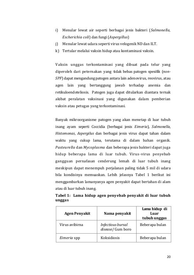 - 29. 20 i) Menular lewat air seperti berbagai jenis bakteri (Salmonella, Escherichia coli) dan fungi (Aspergillus) j) Menular lewat udara seperti virus velogenik ND dan ILT. k) Tertular melalui vaksin hidup atau kontaminasi vaksin. Vaksin unggas terkontaminasi yang dibuat pada telur yang diperoleh dari peternakan yang tidak bebas patogen spesifik (non- SPF) dapat mengandung patogen antara lain adenovirus, reovirus, atau agen lain yang bertanggung jawab terhadap anemia dan retikuloendoteliosis. Patogen juga dapat ditularkan diantara ternak akibat peralatan vaksinasi yang digunakan dalam pemberian vaksin atau petugas yang terkontaminasi. Banyak mikroorganisme patogen yang akan menetap di luar tubuh inang ayam seperti Coccidia (berbagai jenis Eimeria), Salmonella, Histomonas, Aspergilus dan berbagai jenis virus dapat tahan dalam waktu yang cukup lama, terutama di dalam bahan organik. Pasteurella dan Mycoplasma dan beberapa jenis bakteri dapat juga hidup beberapa lama di luar tubuh. Virus-virus penyebab gangguan pernafasan cenderung lemah di luar tubuh inang meskipun dapat menempuh perjalanan paling tidak 5 mil di udara bila kondisinya memuaskan. Lebih jelasnya Tabel 1 berikut ini menggambarkan lamanyanya agen penyakit dapat bertahan di alam atau di luar tubuh inang. Tabel 1: Lama hidup agen penyebab penyakit di luar tubuh unggas Agen Penyakit Nama penyakit Lama hidup di Luar tubuh unggas Virus avibirna Infectious bursal disease/ Gum boro Beberapa bulan Eimeria spp Koksidiosis Beberapa bulan
