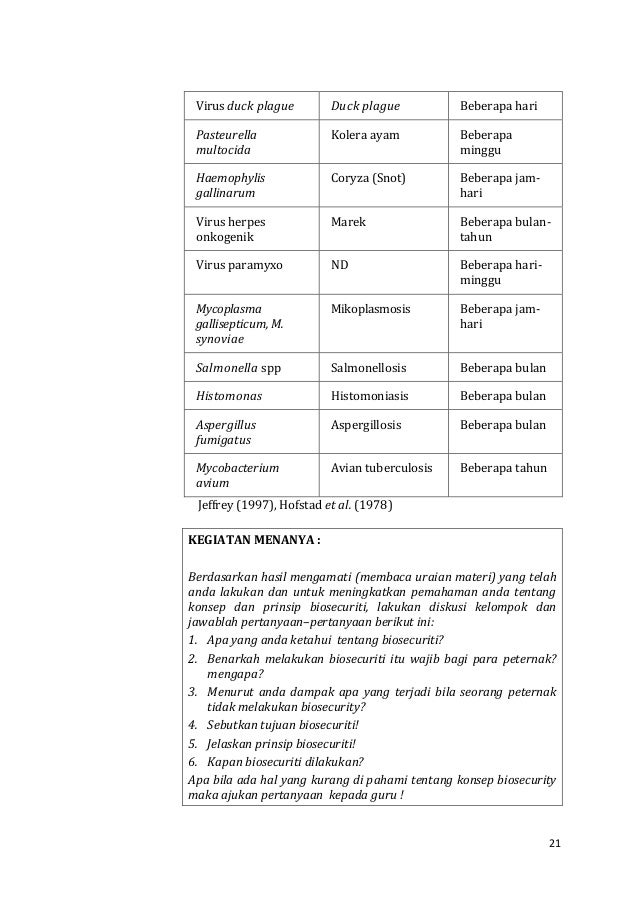 - 30. 21 Virus duck plague Duck plague Beberapa hari Pasteurella multocida Kolera ayam Beberapa minggu Haemophylis gallinarum Coryza (Snot) Beberapa jam- hari Virus herpes onkogenik Marek Beberapa bulan- tahun Virus paramyxo ND Beberapa hari- minggu Mycoplasma gallisepticum, M. synoviae Mikoplasmosis Beberapa jam- hari Salmonella spp Salmonellosis Beberapa bulan Histomonas Histomoniasis Beberapa bulan Aspergillus fumigatus Aspergillosis Beberapa bulan Mycobacterium avium Avian tuberculosis Beberapa tahun Jeffrey (1997), Hofstad et al. (1978) KEGIATAN MENANYA : Berdasarkan hasil mengamati (membaca uraian materi) yang telah anda lakukan dan untuk meningkatkan pemahaman anda tentang konsep dan prinsip biosecuriti, lakukan diskusi kelompok dan jawablah pertanyaan–pertanyaan berikut ini: 1. Apa yang anda ketahui tentang biosecuriti? 2. Benarkah melakukan biosecuriti itu wajib bagi para peternak? mengapa? 3. Menurut anda dampak apa yang terjadi bila seorang peternak tidak melakukan biosecurity? 4. Sebutkan tujuan biosecuriti! 5. Jelaskan prinsip biosecuriti! 6. Kapan biosecuriti dilakukan? Apa bila ada hal yang kurang di pahami tentang konsep biosecurity maka ajukan pertanyaan kepada guru !