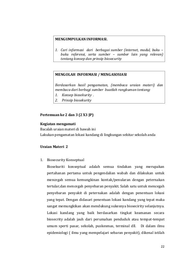 - 31. 22 MENGUMPULKAN INFORMASI. 1. Cari informasi dari berbagai sumber (internet, modul, buku – buku referensi, serta sumber – sumber lain yang relevan) tentang konsep dan prinsip biosecurity MENGOLAH INFORMASI / MENGASOSIASI Berdasarkan hasil pengamatan, (membaca uraian materi) dan membaca dari berbagi sumber buatlah rangkuman tentang: 1. Konsep biosekurity . 2. Prinsip biosekurity Pertemuan ke 2 dan 3 (2 X3 JP) Kegiatan mengamati Bacalah uraian materi di bawah ini Lakukan pengamatan lokasi kandang di lingkungan sekitar sekolah anda Uraian Materi 2 1. Biosecurity Konseptual Biosekuriti konseptual adalah semua tindakan yang merupakan pertahanan pertama untuk pengendalian wabah dan dilakukan untuk mencegah semua kemungkinan kontak/penularan dengan peternakan tertular,dan mencegah penyebaran penyakit. Salah satu untuk mencegah penyebaran penyakit di peternakan adalah dengan penentuan lokasi yang tepat. Dengan didasari penentuan lokasi kandang yang tepat maka sangat memungkikan akan mendukung sukesnya biosecirity selanjutnya. Lokasi kandang yang baik berdasarkan tingkat keamanan secara biosecrity adalah jauh dari perumahan penduduk atau tempat-tempat umum sperti pasar, sekolah, puskesmas, terminal dll. Di dalam ilmu epidemiologi ( ilmu yang mempelajari sebaran penyakit), dikenal istilah