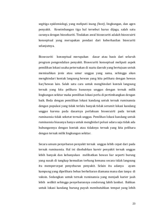- 32. 23 segitiga epidemiologi, yang meliputi inang (host), lingkungan, dan agen penyakit. Keseimbangan tiga hal tersebut harus dijaga, salah satu caranya dengan biosekuriti. Tindakan awal biosecuriti adalah biosecuirti konseptual yang merupakan pondasi dari keberhasilan bisecuriti selanjutnya. Biosecuriti konseptual merupakan dasar atau basis dari seluruh program pengendalian penyakit. Biosecuriti konseptual meliputi aspek pemilihan lokasi usaha peternakan di suatu daerah yang bertujuan untuk memisahkan jenis atau umur unggas yang sama, sehingga akan menghindari kontak langsung hewan yang kita pelihara dengan hewan liar/hewan lain. Salah satu cara untuk menghindari kontak langsung ternak yang kita pelihara kususnya unggas dengan ternak milik lingkungan sekitar maka pemlihan lokasi perlu di pertimbangkan dengan baik. Beda dengan pemilihan lokasi kandang untuk ternak ruminansia dengan populasi yang tidak terlalu banyak tidak serumit lokasi kandang unggas karena pada dasarnya perlakuan biosecuirti pada ternak ruminansia tidak seketat ternak unggas. Pemlihan lokasi kandang untuk ruminansia biasanya hanya untuk menghidari polusi udara saja tidak ada hubungannya dengan kontak atau tidaknya ternak yang kita pelihara dengan ternak milik lingkungan sekitar. Secara umum penyebaran penyakit ternak unggas lebih cepat dari pada ternak ruminansia. Hal ini disebabkan kareir penyakit ternak unggas lebih banyak dan kebanyakan melibatkan hewan liar seperti burung yang susah di tangkap kemudian terbang kemana secara tidak langsung itu mempercepat penyebaran penyakit. Selain itu adanya ayam kampung yang dipelihara bebas berkeliaran diamana mana dan tanpa di vaksin. Sedangkan untuk ternak ruminansia yang menjadi karier jauh lebih sedikit sehingga penyebarannya cenderung labih lambat. Bahkan untuk lokasi kandang burung puyuh membutuhkan tempat yang lebih