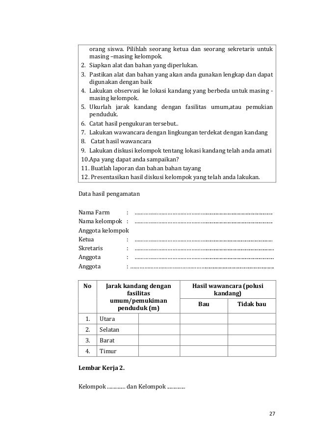 - 36. 27 orang siswa. Pilihlah seorang ketua dan seorang sekretaris untuk masing –masing kelompok. 2. Siapkan alat dan bahan yang diperlukan. 3. Pastikan alat dan bahan yang akan anda gunakan lengkap dan dapat digunakan dengan baik 4. Lakukan observasi ke lokasi kandang yang berbeda untuk masing - masing kelompok. 5. Ukurlah jarak kandang dengan fasilitas umum,atau pemukian penduduk. 6. Catat hasil pengukuran tersebut.. 7. Lakukan wawancara dengan lingkungan terdekat dengan kandang 8. Catat hasil wawancara 9. Lakukan diskusi kelompok tentang lokasi kandang telah anda amati 10.Apa yang dapat anda sampaikan? 11. Buatlah laporan dan bahan bahan tayang 12. Presentasikan hasil diskusi kelompok yang telah anda lakukan. Data hasil pengamatan Nama Farm : ……………………………………….................................................... Nama kelompok : ……………………………………….................................................... Anggota kelompok Ketua : ……………………………………….................................................... Skretaris : ………………………………………..................................................... Anggota : ………………………………………..................................................... Anggota : …………………………………………..................................................... No Jarak kandang dengan fasilitas umum/pemukiman penduduk (m) Hasil wawancara (polusi kandang) Bau Tidak bau 1. Utara 2. Selatan 3. Barat 4. Timur Lembar Kerja 2. Kelompok .............. dan Kelompok ..............