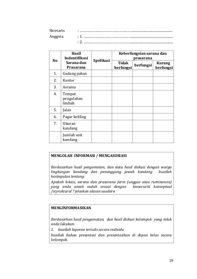 - 38. 29 Skretaris : ………………………………………………................................................ Anggota : 1. …………………………………………................................................... : 2. …………………………………………................................................... No Hasil Indentifikasi Sarana dan Prasarana Spefikasi Keberfungsian sarana dan prasarana Tidak berfungsi berfungsi Kurang berfungsi 1. Gudang pakan 2. Kantor 3. Asrama 4. Tempat pengolahan limbah 5. Jalan 6. Pagar keliling 7. Ukuran kandang Jumlah unit kandang MENGOLAH INFORMASI / MENGASOSIASI Berdasarkan hasil pengamatan, dan data hasil diskusi dengan warga lingkungan kandang dan penanggung jawab kandang buatlah kesimpulan tentang: Apakah lokasi, sarana dan prasarana farm (unggas atau ruminansia) yang anda amati sudah sesuai dengan biosecuriti konseptual /styruktural ? jelaskan alasan saudara MENGINFORMASIKAN Berdasarkan hasil pengamatan, dan hasil diskusi kelompok yang telah anda lakukan: 1. buatlah laporan tertulis secara individu buatlah bahan presentasi dan presentasikan di depan kelas secara kelompok.