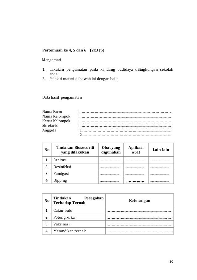 - 39. 30 Pertemuan ke 4, 5 dan 6 (2x3 Jp) Mengamati 1. Lakukan pengamatan pada kandang budidaya dilingkungan sekolah anda. 2. Pelajari materi di bawah ini dengan baik. Data hasil pengamatan Nama Farm : ................................................................................................................ Nama Kelompok : ................................................................................................................ Ketua Kelompok : ................................................................................................................ Skretaris : ................................................................................................................ Anggota : 1.............................................................................................................. : 2.............................................................................................................. No Tindakan Biosecuriti yang dilakukan Obat yang digunakan Aplikasi obat Lain-lain 1. Sanitasi ....................... ....................... ....................... 2. Desinfeksi ....................... ....................... ....................... 3. Fumigasi ....................... ....................... ....................... 4. Dipping ....................... ....................... ....................... No Tindakan Pecegahan Terhadap Ternak Keterangan 1. Cukur bulu ............................................................................... 2. Potong kuku ............................................................................... 3. Vaksinasi ............................................................................... 4. Memndikan ternak ...............................................................................