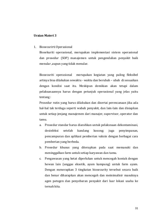 - 40. 31 Uraian Materi 3 1. Biosecurirti Operasional Biosekuriti operasional, merupakan implementasi sistem operasional dan prosedur (SOP) manajemen untuk pengendalian penyakit baik menular ,aupun yang tidak menular. Biosecuriti operasional merupakan kegiatan yang paling fleksibel artinya bisa dilakukan sewaktu - waktu dan berubah – ubah di sesuaikan dengan kondisi saat itu. Meskipun demikian akan tetapi dalam pelaksanaannya harus dengan petunjuk operasional yang jelas yaitu tentang : Prosedur rutin yang harus dilakukan dan disertai perencanaan jika ada hal-hal tak terduga seperti wabah penyakit, dan lain-lain dan disiapkan untuk setiap jenjang manajemen dari manajer, supervisor, operator dan tamu. a. Prosedur standar harus diarahkan untuk pelaksnaan dekontaminasi, desinfeksi setelah kandang kosong; juga penyimpanan, pencampuran dan aplikasi pemberian vaksin dengan berbagai cara pemberian yang berbeda. b. Prosedur khusus yang diterapkan pada saat memasuki dan meninggalkan farm untuk setiap karyawan dan tamu. c. Pengawasan yang ketat diperlukan untuk mencegah kontak dengan hewan lain (unggas eksotik, ayam kampung) untuk farm ayam. Dengan menerapkan 3 tingkatan biosecurity tersebut secara baik dan benar diharapkan akan mencegah dan meinimalisir masuknya agen patogen dan penyebaran penyakit dari luar lokasi usaha ke ternak kita.