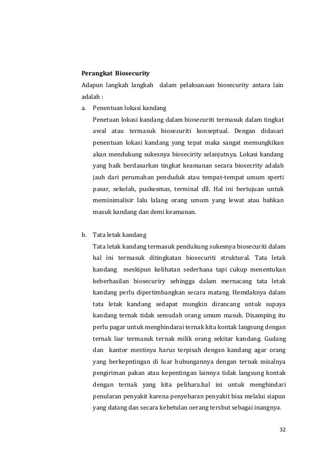 - 41. 32 Perangkat Biosecurity Adapun langkah langkah dalam pelaksanaan biosecurity antara lain adalah : a. Penentuan lokasi kandang Penetuan lokasi kandang dalam biosecuriti termasuk dalam tingkat awal atau termasuk biosecuriti konseptual. Dengan didasari penentuan lokasi kandang yang tepat maka sangat memungkikan akan mendukung sukesnya biosecirity selanjutnya. Lokasi kandang yang baik berdasarkan tingkat keamanan secara biosecrity adalah jauh dari perumahan penduduk atau tempat-tempat umum sperti pasar, sekolah, puskesmas, terminal dll. Hal ini bertujuan untuk meminimalisir lalu lalang orang umum yang lewat atau bahkan masuk kandang dan demi keamanan. b. Tata letak kandang Tata letak kandang termasuk pendukung sukesnya biosecuriti dalam hal ini termasuk ditingkatan biosecuriti struktural. Tata letak kandang meskipun kelihatan sederhana tapi cukup menentukan keberhasilan biosecuriry sehingga dalam mernacang tata letak kandang perlu dipertimbangkan secara matang. Hemdaknya dalam tata letak kandang sedapat mungkin dirancang untuk supaya kandang ternak tidak semudah orang umum masuk. Disamping itu perlu pagar untuk menghindarai ternak kita kontak langsung dengan ternak liar termasuk ternak milik orang sekitar kandang. Gudang dan kantor mestinya harus terpisah dengan kandang agar orang yang berkepntingan di luar hubungannya dengan ternak misalnya pengiriman pakan atau kepentingan lainnya tidak langsung kontak dengan ternak yang kita pelihara.hal ini untuk menghindari penularan penyakit karena penyebaran penyakit bisa melalui siapun yang datang dan secara kebetulan oerang tersbut sebagai inangnya.