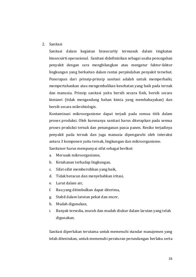 - 42. 33 2. Sanitasi Sanitasi dalam kegiatan biosecurity termasuk dalam tingkatan biosecuirti operasional. Sanitasi didefinisikan sebagai usaha pencegahan penyakit dengan cara menghilangkan atau mengatur faktor-faktor lingkungan yang berkaitan dalam rantai perpindahan penyakit tersebut. Penerapan dari prinsip-prinsip sanitasi adalah untuk memperbaiki, mempertahankan atau mengembalikan kesehatan yang baik pada ternak dan manusia. Prinsip sanitasi yaitu bersih secara fisik, bersih secara kimiawi (tidak mengandung bahan kimia yang membahayakan) dan bersih secara mikrobiologis. Kontaminasi mikroorganisme dapat terjadi pada semua titik dalam proses produksi. Oleh karenanya sanitasi harus diterapkan pada semua proses produksi ternak dan penanganan pasca panen. Resiko terjadinya penyakit pada ternak dan juga manusia dipengaruhi oleh interaksi antara 3 komponen yaitu ternak, lingkungan dan mikroorganisme. Sanitaiser harus mempunyai sifat sebagai berikut: a. Merusak mikroorganisme, b. Ketahanan terhadap lingkungan, c. Sifat-sifat membersihkan yang baik, d. Tidak beracun dan menyebabkan iritasi, e. Larut dalam air, f. Bau yang ditimbulkan dapat diterima, g. Stabil dalam larutan pekat dan encer, h. Mudah digunakan, i. Banyak tersedia, murah dan mudah diukur dalam larutan yang telah digunakan. Sanitasi diperlukan terutama untuk memenuhi standar manajemen yang telah ditentukan, untuk memenuhi peraturan perundangan berlaku serta