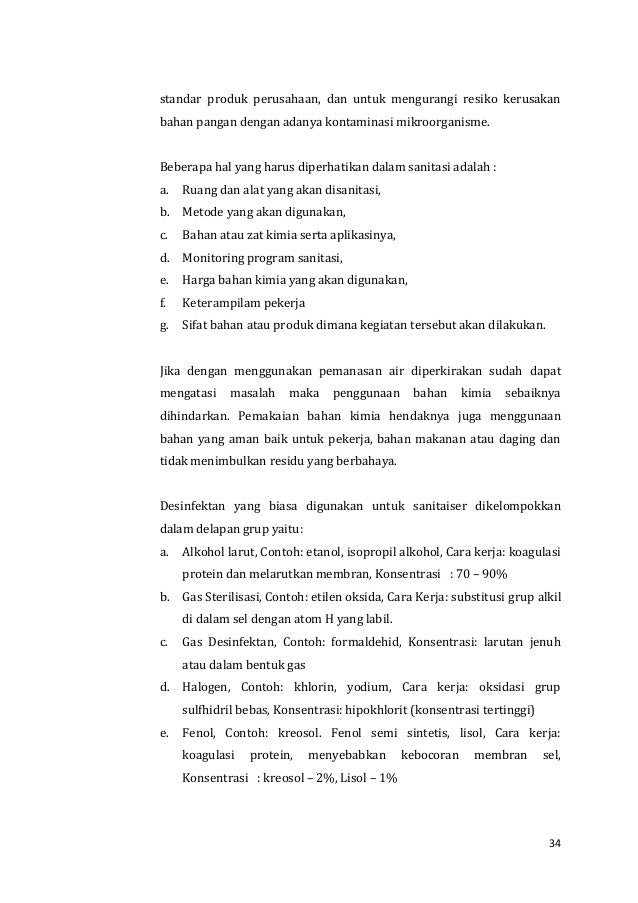 - 43. 34 standar produk perusahaan, dan untuk mengurangi resiko kerusakan bahan pangan dengan adanya kontaminasi mikroorganisme. Beberapa hal yang harus diperhatikan dalam sanitasi adalah : a. Ruang dan alat yang akan disanitasi, b. Metode yang akan digunakan, c. Bahan atau zat kimia serta aplikasinya, d. Monitoring program sanitasi, e. Harga bahan kimia yang akan digunakan, f. Keterampilam pekerja g. Sifat bahan atau produk dimana kegiatan tersebut akan dilakukan. Jika dengan menggunakan pemanasan air diperkirakan sudah dapat mengatasi masalah maka penggunaan bahan kimia sebaiknya dihindarkan. Pemakaian bahan kimia hendaknya juga menggunaan bahan yang aman baik untuk pekerja, bahan makanan atau daging dan tidak menimbulkan residu yang berbahaya. Desinfektan yang biasa digunakan untuk sanitaiser dikelompokkan dalam delapan grup yaitu: a. Alkohol larut, Contoh: etanol, isopropil alkohol, Cara kerja: koagulasi protein dan melarutkan membran, Konsentrasi : 70 – 90% b. Gas Sterilisasi, Contoh: etilen oksida, Cara Kerja: substitusi grup alkil di dalam sel dengan atom H yang labil. c. Gas Desinfektan, Contoh: formaldehid, Konsentrasi: larutan jenuh atau dalam bentuk gas d. Halogen, Contoh: khlorin, yodium, Cara kerja: oksidasi grup sulfhidril bebas, Konsentrasi: hipokhlorit (konsentrasi tertinggi) e. Fenol, Contoh: kreosol. Fenol semi sintetis, lisol, Cara kerja: koagulasi protein, menyebabkan kebocoran membran sel, Konsentrasi : kreosol – 2%, Lisol – 1%