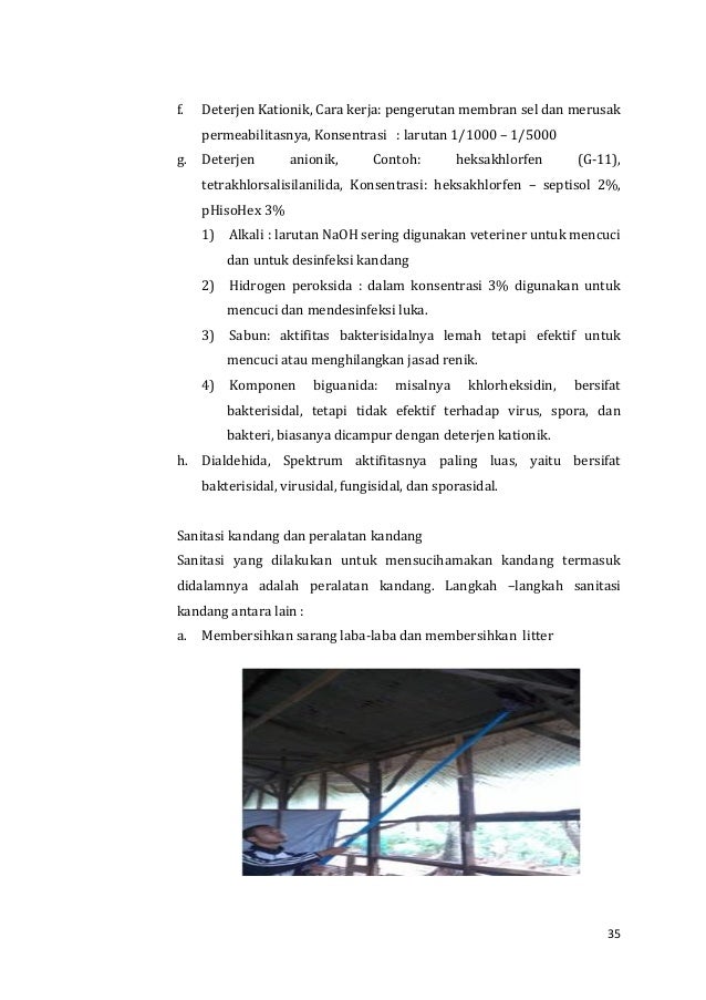 - 44. 35 f. Deterjen Kationik, Cara kerja: pengerutan membran sel dan merusak permeabilitasnya, Konsentrasi : larutan 1/1000 – 1/5000 g. Deterjen anionik, Contoh: heksakhlorfen (G-11), tetrakhlorsalisilanilida, Konsentrasi: heksakhlorfen – septisol 2%, pHisoHex 3% 1) Alkali : larutan NaOH sering digunakan veteriner untuk mencuci dan untuk desinfeksi kandang 2) Hidrogen peroksida : dalam konsentrasi 3% digunakan untuk mencuci dan mendesinfeksi luka. 3) Sabun: aktifitas bakterisidalnya lemah tetapi efektif untuk mencuci atau menghilangkan jasad renik. 4) Komponen biguanida: misalnya khlorheksidin, bersifat bakterisidal, tetapi tidak efektif terhadap virus, spora, dan bakteri, biasanya dicampur dengan deterjen kationik. h. Dialdehida, Spektrum aktifitasnya paling luas, yaitu bersifat bakterisidal, virusidal, fungisidal, dan sporasidal. Sanitasi kandang dan peralatan kandang Sanitasi yang dilakukan untuk mensucihamakan kandang termasuk didalamnya adalah peralatan kandang. Langkah –langkah sanitasi kandang antara lain : a. Membersihkan sarang laba-laba dan membersihkan litter
