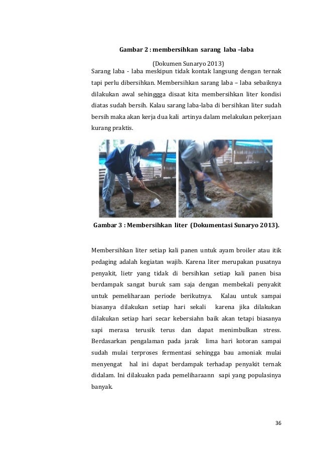 - 45. 36 Gambar 2 : membersihkan sarang laba –laba (Dokumen Sunaryo 2013) Sarang laba - laba meskipun tidak kontak langsung dengan ternak tapi perlu dibersihkan. Membersihkan sarang laba – laba sebaiknya dilakukan awal sehinggga disaat kita membersihkan liter kondisi diatas sudah bersih. Kalau sarang laba-laba di bersihkan liter sudah bersih maka akan kerja dua kali artinya dalam melakukan pekerjaan kurang praktis. Gambar 3 : Membersihkan liter (Dokumentasi Sunaryo 2013). Membersihkan liter setiap kali panen untuk ayam broiler atau itik pedaging adalah kegiatan wajib. Karena liter merupakan pusatnya penyakit, lietr yang tidak di bersihkan setiap kali panen bisa berdampak sangat buruk sam saja dengan membekali penyakit untuk pemeliharaan periode berikutnya. Kalau untuk sampai biasanya dilakukan setiap hari sekali karena jika dilakukan dilakukan setiap hari secar kebersiahn baik akan tetapi biasanya sapi merasa terusik terus dan dapat menimbulkan stress. Berdasarkan pengalaman pada jarak lima hari kotoran sampai sudah mulai terproses fermentasi sehingga bau amoniak mulai menyengat hal ini dapat berdampak terhadap penyakit ternak didalam. Ini dilakuakn pada pemeliharaann sapi yang populasinya banyak.