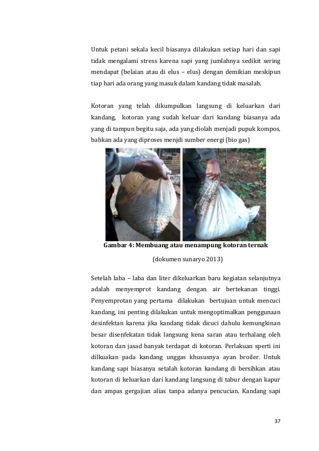 - 46. 37 Untuk petani sekala kecil biasanya dilakukan setiap hari dan sapi tidak mengalami stress karena sapi yang jumlahnya sedikit sering mendapat (belaian atau di elus – elus) dengan demikian meskipun tiap hari ada orang yang masuk dalam kandang tidak masalah. Kotoran yang telah dikumpulkan langsung di keluarkan dari kandang, kotoran yang sudah keluar dari kandang biasanya ada yang di tampun begitu saja, ada yang diolah menjadi pupuk kompos, bahkan ada yang diproses menjdi sumber energi (bio gas) Gambar 4: Membuang atau menampung kotoran ternak (dokumen sunaryo 2013) Setelah laba – laba dan liter dikeluarkan baru kegiatan selanjutnya adalah menyemprot kandang dengan air bertekanan tinggi. Penyemprotan yang pertama dilakukan bertujuan untuk mencuci kandang, ini penting dilakukan untuk mengoptimalkan penggunaan desinfektan karena jika kandang tidak dicuci dahulu kemungkinan besar disenfekatan tidak langsung kena saran atau terhalang oleh kotoran dan jasad banyak terdapat di kotoran. Perlakuan sperti ini dilkuakan pada kandang unggas khususnya ayan broiler. Untuk kandang sapi biasanya setalah kotoran kandang di bersihkan atau kotoran di keluarkan dari kandang langsung di tabur dengan kapur dan ampas gergajian alias tanpa adanya pencucian. Kandang sapi