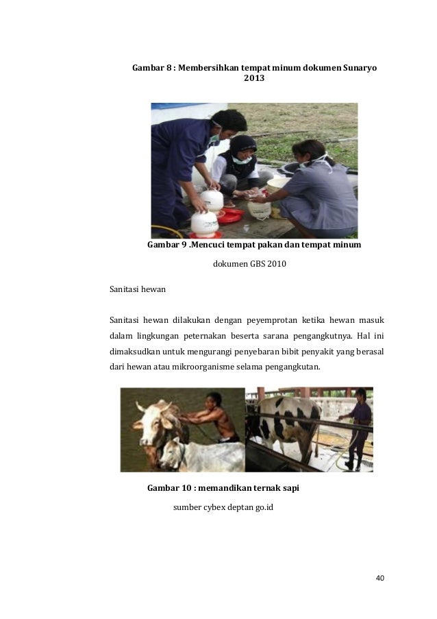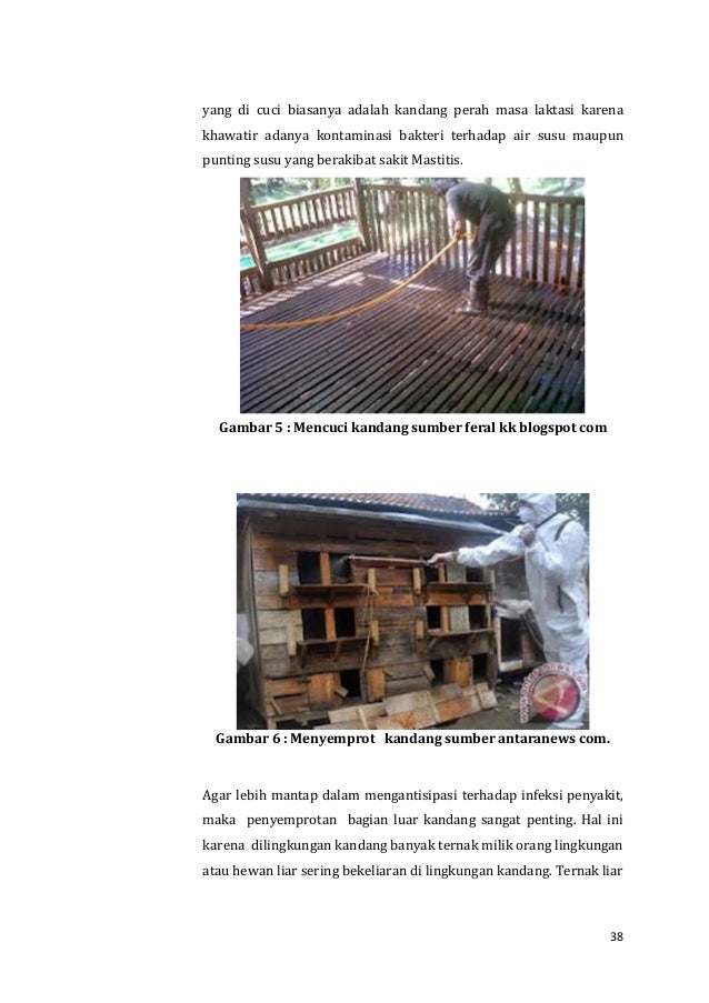 - 47. 38 yang di cuci biasanya adalah kandang perah masa laktasi karena khawatir adanya kontaminasi bakteri terhadap air susu maupun punting susu yang berakibat sakit Mastitis. Gambar 5 : Mencuci kandang sumber feral kk blogspot com Gambar 6 : Menyemprot kandang sumber antaranews com. Agar lebih mantap dalam mengantisipasi terhadap infeksi penyakit, maka penyemprotan bagian luar kandang sangat penting. Hal ini karena dilingkungan kandang banyak ternak milik orang lingkungan atau hewan liar sering bekeliaran di lingkungan kandang. Ternak liar