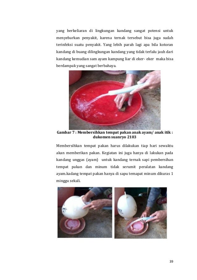 - 48. 39 yang berkeliaran di lingkungan kandang sangat potensi untuk menyebarkan penyakit, karena ternak tersebut bisa juga sudah terinfeksi suatu penyakit. Yang lebih parah lagi apa bila kotoran kandang di buang dilingkungan kandang yang tidak terlalu jauh dari kandang kemudian sam ayam kampung liar di eker- eker maka bisa berdampak yang sangat berbahaya. Gambar 7 : Membersihkan tempat pakan anak ayam/ anak itik : dukomen suanryo 2103 Membersihkan tempat pakan harus dilakukan tiap hari sewaktu akan memberikan pakan. Kegiatan ini juga hanya di lakukan pada kandang unggas (ayam) untuk kandang ternak sapi pembersihan tempat pakan dan minum tidak serumit peralatan kandang ayam.kadang tempat pakan hanya di sapu temapat minum dikuras 1 minggu sekali.