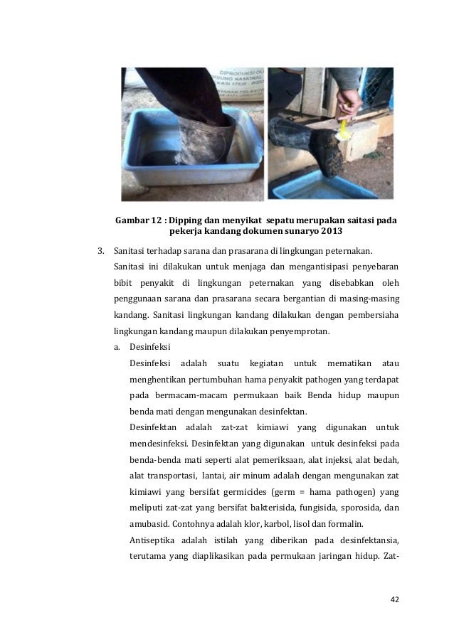 - 51. 42 Gambar 12 : Dipping dan menyikat sepatu merupakan saitasi pada pekerja kandang dokumen sunaryo 2013 3. Sanitasi terhadap sarana dan prasarana di lingkungan peternakan. Sanitasi ini dilakukan untuk menjaga dan mengantisipasi penyebaran bibit penyakit di lingkungan peternakan yang disebabkan oleh penggunaan sarana dan prasarana secara bergantian di masing-masing kandang. Sanitasi lingkungan kandang dilakukan dengan pembersiaha lingkungan kandang maupun dilakukan penyemprotan. a. Desinfeksi Desinfeksi adalah suatu kegiatan untuk mematikan atau menghentikan pertumbuhan hama penyakit pathogen yang terdapat pada bermacam-macam permukaan baik Benda hidup maupun benda mati dengan mengunakan desinfektan. Desinfektan adalah zat-zat kimiawi yang digunakan untuk mendesinfeksi. Desinfektan yang digunakan untuk desinfeksi pada benda-benda mati seperti alat pemeriksaan, alat injeksi, alat bedah, alat transportasi, lantai, air minum adalah dengan mengunakan zat kimiawi yang bersifat germicides (germ = hama pathogen) yang meliputi zat-zat yang bersifat bakterisida, fungisida, sporosida, dan amubasid. Contohnya adalah klor, karbol, lisol dan formalin. Antiseptika adalah istilah yang diberikan pada desinfektansia, terutama yang diaplikasikan pada permukaan jaringan hidup. Zat-