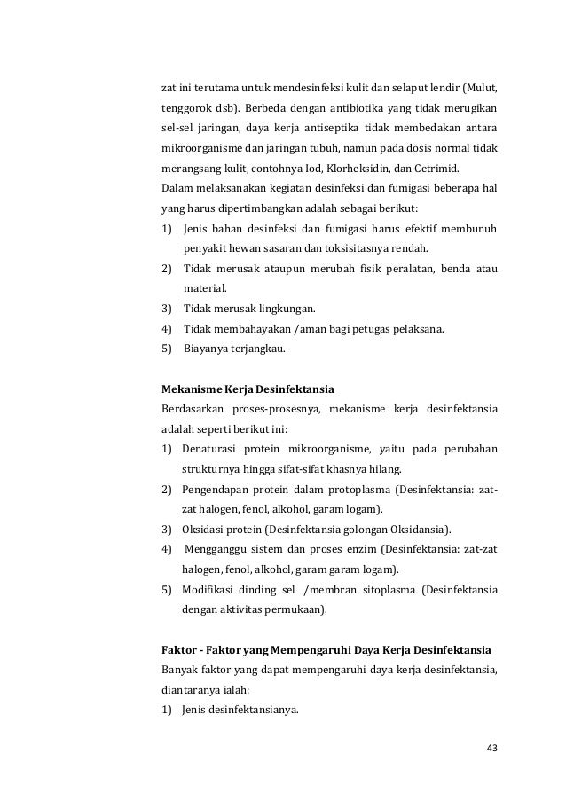 - 52. 43 zat ini terutama untuk mendesinfeksi kulit dan selaput lendir (Mulut, tenggorok dsb). Berbeda dengan antibiotika yang tidak merugikan sel-sel jaringan, daya kerja antiseptika tidak membedakan antara mikroorganisme dan jaringan tubuh, namun pada dosis normal tidak merangsang kulit, contohnya Iod, Klorheksidin, dan Cetrimid. Dalam melaksanakan kegiatan desinfeksi dan fumigasi beberapa hal yang harus dipertimbangkan adalah sebagai berikut: 1) Jenis bahan desinfeksi dan fumigasi harus efektif membunuh penyakit hewan sasaran dan toksisitasnya rendah. 2) Tidak merusak ataupun merubah fisik peralatan, benda atau material. 3) Tidak merusak lingkungan. 4) Tidak membahayakan /aman bagi petugas pelaksana. 5) Biayanya terjangkau. Mekanisme Kerja Desinfektansia Berdasarkan proses-prosesnya, mekanisme kerja desinfektansia adalah seperti berikut ini: 1) Denaturasi protein mikroorganisme, yaitu pada perubahan strukturnya hingga sifat-sifat khasnya hilang. 2) Pengendapan protein dalam protoplasma (Desinfektansia: zat- zat halogen, fenol, alkohol, garam logam). 3) Oksidasi protein (Desinfektansia golongan Oksidansia). 4) Mengganggu sistem dan proses enzim (Desinfektansia: zat-zat halogen, fenol, alkohol, garam garam logam). 5) Modifikasi dinding sel /membran sitoplasma (Desinfektansia dengan aktivitas permukaan). Faktor - Faktor yang Mempengaruhi Daya Kerja Desinfektansia Banyak faktor yang dapat mempengaruhi daya kerja desinfektansia, diantaranya ialah: 1) Jenis desinfektansianya.