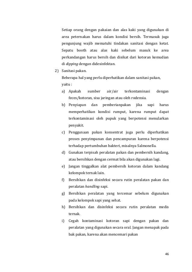 - 55. 46 Setiap orang dengan pakaian dan alas kaki yang digunakan di area peternakan harus dalam kondisi bersih. Termasuk juga pengunjung wajib mematuhi tindakan sanitasi dengan ketat. Sepatu booth atau alas kaki sebelum masuk ke area perkandangan harus bersih dan disikat dari kotoran kemudian di dipping dengan didesinfektan. 2) Sanitasi pakan. Beberapa hal yang perlu diperhatikan dalam sanitasi pakan, yaitu : a) Apakah sumber air/air terkontaminasi dengan feces/kotoran, sisa jaringan atau oleh rodensia. b) Penyiapan dan pemberianpakan jika sapi harus memperhatikan kondisi rumput, karena rumput dapat terkontaminasi oleh pupuk yang berpotensi menularkan penyakit. c) Penggunaan pakan konsentrat juga perlu diperhatikan proses penyimpanan dan pencampuran karena berpotensi terhadap pertumbuhan bakteri, misalnya Salmonella. d) Gunakan terpisah peralatan pakan dan pembersih kandang, atau bersihkan dengan cermat bila akan digunakan lagi. e) Jangan tinggalkan alat pembersih kotoran dalam kandang kelompok ternak lain. f) Bersihkan dan disinfeksi secara rutin peralatan pakan dan peralatan handling sapi. g) Bersihkan peralatan yang tercemar sebelum digunakan pada kelompok sapi yang sehat. h) Bersihkan dan disinfeksi secara rutin peralatan medis ternak. i) Cegah kontaminasi kotoran sapi dengan pakan dan peralatan yang digunakan secara oral. Jangan menapak pada bak pakan, karena akan mencemari pakan