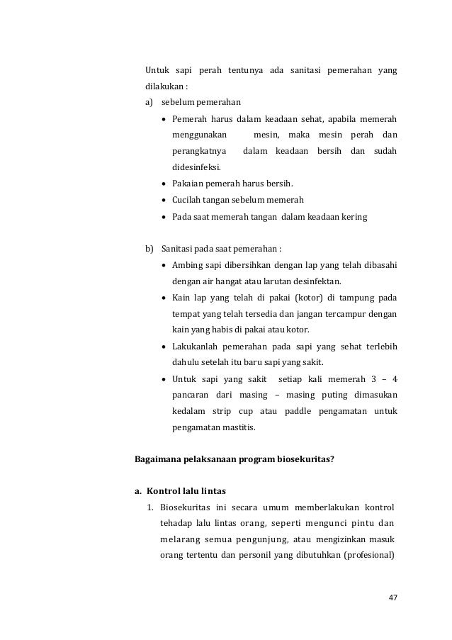 - 56. 47 Untuk sapi perah tentunya ada sanitasi pemerahan yang dilakukan : a) sebelum pemerahan Pemerah harus dalam keadaan sehat, apabila memerah menggunakan mesin, maka mesin perah dan perangkatnya dalam keadaan bersih dan sudah didesinfeksi. Pakaian pemerah harus bersih. Cucilah tangan sebelum memerah Pada saat memerah tangan dalam keadaan kering b) Sanitasi pada saat pemerahan : Ambing sapi dibersihkan dengan lap yang telah dibasahi dengan air hangat atau larutan desinfektan. Kain lap yang telah di pakai (kotor) di tampung pada tempat yang telah tersedia dan jangan tercampur dengan kain yang habis di pakai atau kotor. Lakukanlah pemerahan pada sapi yang sehat terlebih dahulu setelah itu baru sapi yang sakit. Untuk sapi yang sakit setiap kali memerah 3 – 4 pancaran dari masing – masing puting dimasukan kedalam strip cup atau paddle pengamatan untuk pengamatan mastitis. Bagaimana pelaksanaan program biosekuritas? a. Kontrol lalu lintas 1. Biosekuritas ini secara umum memberlakukan kontrol tehadap lalu lintas orang, seperti mengunci pintu dan melarang semua pengunjung, atau mengizinkan masuk orang tertentu dan personil yang dibutuhkan (profesional)