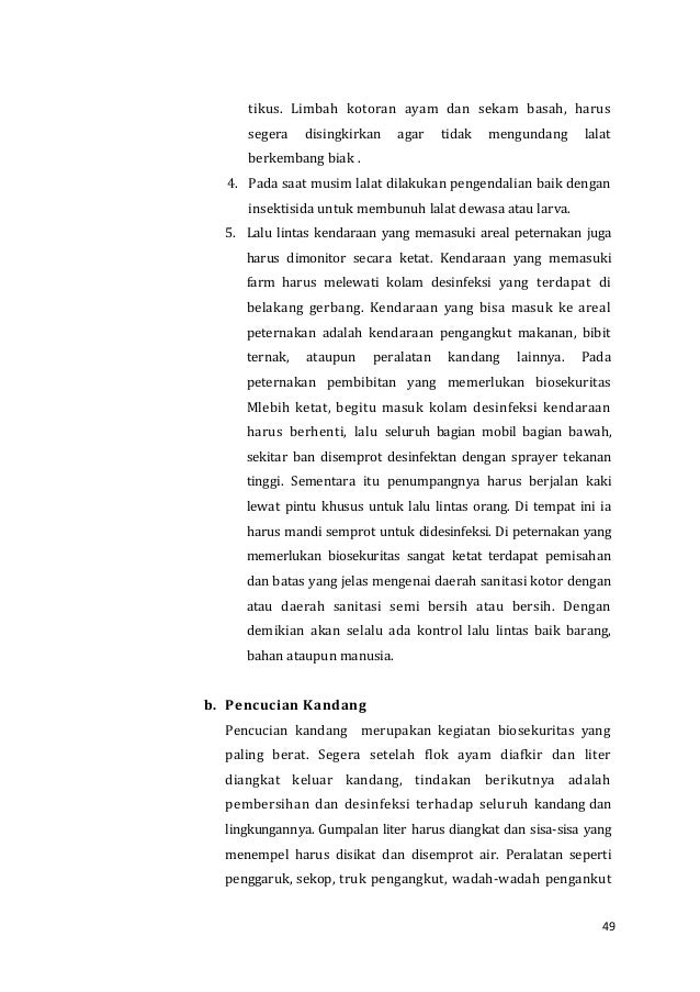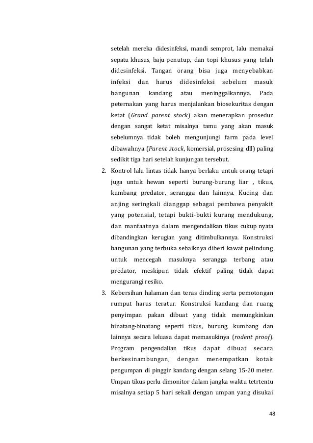 - 57. 48 setelah mereka didesinfeksi, mandi semprot, lalu memakai sepatu khusus, baju penutup, dan topi khusus yang telah didesinfeksi. Tangan orang bisa juga menyebabkan infeksi dan harus didesinfeksi sebelum masuk bangunan kandang atau meninggalkannya. Pada peternakan yang harus menjalankan biosekuritas dengan ketat (Grand parent stock) akan menerapkan prosedur dengan sangat ketat misalnya tamu yang akan masuk sebelumnya tidak boleh mengunjungi farm pada level dibawahnya (Parent stock, komersial, prosesing dll) paling sedikit tiga hari setelah kunjungan tersebut. 2. Kontrol lalu lintas tidak hanya berlaku untuk orang tetapi juga untuk hewan seperti burung-burung liar , tikus, kumbang predator, serangga dan lainnya. Kucing dan anjing seringkali dianggap sebagai pembawa penyakit yang potensial, tetapi bukti-bukti kurang mendukung, dan manfaatnya dalam mengendalikan tikus cukup nyata dibandingkan kerugian yang ditimbulkannya. Konstruksi bangunan yang terbuka sebaiknya diberi kawat pelindung untuk mencegah masuknya serangga terbang atau predator, meskipun tidak efektif paling tidak dapat mengurangi resiko. 3. Kebersihan halaman dan teras dinding serta pemotongan rumput harus teratur. Konstruksi kandang dan ruang penyimpan pakan dibuat yang tidak memungkinkan binatang-binatang seperti tikus, burung, kumbang dan lainnya secara leluasa dapat memasukinya (rodent proof). Program pengendalian tikus dapat dibuat secara berkesinambungan, dengan menempatkan kotak pengumpan di pinggir kandang dengan selang 15-20 meter. Umpan tikus perlu dimonitor dalam jangka waktu tetrtentu misalnya setiap 5 hari sekali dengan umpan yang disukai