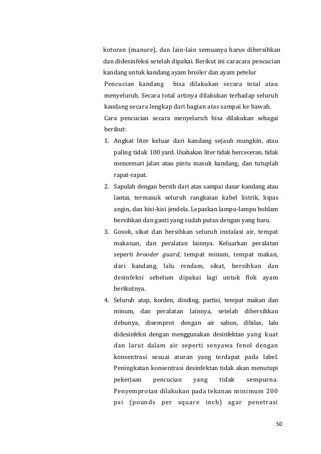 - 59. 50 kotoran (manure), dan lain-lain semuanya harus dibersihkan dan didesinfeksi setelah dipakai. Berikut ini caracara pencucian kandang untuk kandang ayam broiler dan ayam petelur Pencucian kandang bisa dilakukan secara total atau menyeluruh. Secara total artinya dilakukan terhadap seluruh kandang secara lengkap dari bagian atas sampai ke bawah. Cara pencucian secara menyeluruh bisa dilakukan sebagai berikut: 1. Angkat liter keluar dari kandang sejauh mungkin, atau paling tidak 100 yard. Usahakan liter tidak berceceran, tidak mencemari jalan atau pintu masuk kandang, dan tutuplah rapat-rapat. 2. Sapulah dengan bersih dari atas sampai dasar kandang atau lantai, termasuk seluruh rangkaian kabel listrik, kipas angin, dan kisi-kisi jendela. Lepaskan lampu-lampu bohlam bersihkan dan ganti yang sudah putus dengan yang baru. 3. Gosok, sikat dan bersihkan seluruh instalasi air, tempat makanan, dan peralatan lainnya. Keluarkan peralatan seperti brooder guard, tempat minum, tempat makan, dari kandang, lalu rendam, sikat, bersihkan dan desinfeksi sebelum dipakai lagi untuk flok ayam berikutnya. 4. Seluruh atap, korden, dinding, partisi, tempat makan dan minum, dan peralatan lainnya, setelah dibersihkan debunya, disemprot dengan air sabun, dibilas, lalu didesinfeksi dengan menggunakan desinfektan yang kuat dan larut dalam air seperti senyawa fenol dengan konsentrasi sesuai aturan yang terdapat pada label. Peningkatan konsentrasi desinfektan tidak akan menutupi pekerjaan pencucian yang tidak sempurna. Penyemprotan dilakukan pada tekanan minimum 200 psi (pounds per square inch) agar penetrasi
