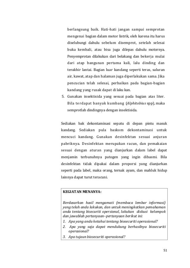 - 60. 51 berlangsung baik. Hati-hati jangan sampai semprotan mengenai bagian dalam motor listrik, oleh karena itu harus diselubungi dahulu sebelum disemprot, setelah selesai buka kembali, atau bisa juga dilepas dahulu motornya. Penyemprotan dilakukan dari belakang dan bekerja mulai dari atap bangunan pertama kali, lalu dinding dan terakhir lantai. Bagian luar kandang seperti teras, saluran air, kawat, atap dan halaman juga diperlakukan sama. Jika pencucian telah selesai, perbaikan pada bagian-bagian kandang yang rusak dapat di laku kan. 5. Gunakan insektisida yang sesuai pada bagian atas liter. Bila terdapat banyak kumbang (Alphitobius spp), maka semprotlah dindingnya dengan insektisida. Sediakan bak dekontaminasi sepatu di depan pintu masuk kandang. Sediakan pula baskom dekontaminasi untuk mencuci kandang. Gunakan desinfektan sesuai anjuran pabriknya. Desinfektan merupakan racun, dan pemakaian sesuai dengan aturan yang dianjurkan dalam label dapat menjamin terbunuhnya patogen yang ingin dibasmi. Bila desinfektan tidak dipakai dalam proporsi yang dianjurkan seperti pada label, maka orang, ternak ayam, dan mahluk hidup lainnya dapat turut teracuni. KEGIATAN MENANYA: Berdasarkan hasil mengamati (membaca lembar informasi) yang telah anda lakukan, dan untuk meningkatkan pemahaman anda tentang bisecuriti opersional, lakukan diskusi kelompok dan jawablah pertanyaan–pertanyaan berikut ini: 1. Apa yang anda ketahui tentang biosecuriti operasional? 2. Apa yang saja dapat mendukung berhasilnya biosecuriti operasional? 3. Apa tujaun biosecuriti operasional?