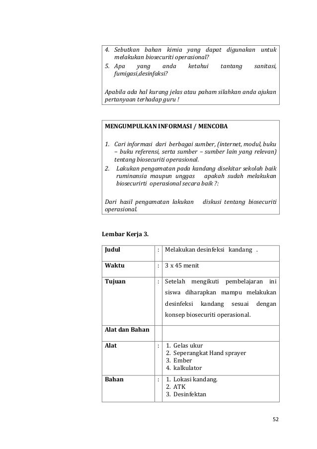 - 61. 52 4. Sebutkan bahan kimia yang dapat digunakan untuk melakukan biosecuriti operasional? 5. Apa yang anda ketahui tantang sanitasi, fumigasi,desinfaksi? Apabila ada hal kurang jelas atau paham silahkan anda ajukan pertanyaan terhadap guru ! MENGUMPULKAN INFORMASI / MENCOBA 1. Cari informasi dari berbagai sumber, (internet, modul, buku – buku referensi, serta sumber – sumber lain yang relevan) tentang biosecuriti operasional. 2. Lakukan pengamatan pada kandang disekitar sekolah baik ruminansia maupun unggas apakah sudah melakukan biosecurirti operasional secara baik ?: Dari hasil pengamatan lakukan diskusi tentang biosecuriti operasional. Lembar Kerja 3. Judul : Melakukan desinfeksi kandang . Waktu : 3 x 45 menit Tujuan : Setelah mengikuti pembelajaran ini siswa diharapkan mampu melakukan desinfeksi kandang sesuai dengan konsep biosecuriti operasional. Alat dan Bahan Alat : 1. Gelas ukur 2. Seperangkat Hand sprayer 3. Ember 4. kalkulator Bahan : 1. Lokasi kandang. 2. ATK 3. Desinfektan