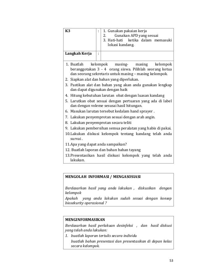 - 62. 53 K3 : 1. Gunakan pakaian kerja 2. Gunakan APD yang sesuai 3. Hati-hati ketika dalam memasuki lokasi kandang. Langkah Kerja : 1. Buatlah kelompok masing- masing kelompok beranggotakan 3 - 4 orang siswa. Pilihlah seorang ketua dan seorang sekretaris untuk masing – masing kelompok. 2. Siapkan alat dan bahan yang diperlukan. 3. Pastikan alat dan bahan yang akan anda gunakan lengkap dan dapat digunakan dengan baik 4. Hitung kebutuhan larutan obat dengan luasan kandang 5. Larutkan obat sesuai dengan pertuaran yang ada di label dan dengan voleme sesusai hasil hitungan. 6. Masukan larutan tersebut kedalam hand sprayer . 7. Lakukan penyemprotan sesuai dengan arah angin. 8. Lakukan penyemprotan secara teliti 9. Lakukan pembersihan semua peralatan yang habis di pakai. 10.Lakukan diskusi kelompok tentang kandang telah anda survai . 11.Apa yang dapat anda sampaikan? 12. Buatlah laporan dan bahan bahan tayang 13.Presentasikan hasil diskusi kelompok yang telah anda lakukan. MENGOLAH INFORMASI / MENGASOSIASI Berdasarkan hasil yang anda lakukan , diskusikan dengan kelompok Apakah yang anda lakukan sudah sesuai dengan konsep biosekurity operasional ? MENGINFORMASIKAN Berdasarkan hasil perlakuan desinfeksi , dan hasil diskusi yang telah anda lakukan: 1. buatlah laporan tertulis secara individu buatlah bahan presentasi dan presentasikan di depan kelas secara kelompok.