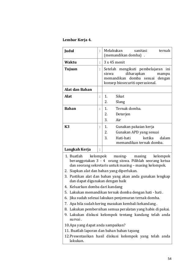 - 63. 54 Lembar Kerja 4. Judul : Melakukan sanitasi ternak (memandikan domba) . Waktu : 3 x 45 menit Tujuan : Setelah mengikuti pembelajaran ini siswa diharapkan mampu memandikan domba sesuai dengan konsep biosecuriti operasional. Alat dan Bahan Alat : 1. Sikat 2. Slang Bahan : 1. Ternak domba. 2. Deterjen 3. Air K3 : 1. Gunakan pakaian kerja 2. Gunakan APD yang sesuai 3. Hati-hati ketika dalam memandikan ternak domba. Langkah Kerja : 1. Buatlah kelompok masing- masing kelompok beranggotakan 3 - 4 orang siswa. Pilihlah seorang ketua dan seorang sekretaris untuk masing – masing kelompok. 2. Siapkan alat dan bahan yang diperlukan. 3. Pastikan alat dan bahan yang akan anda gunakan lengkap dan dapat digunakan dengan baik 4. Keluarkan domba dari kandang 5. Lakukan memandikan ternak domba dengan hati - hati . 6. Jika sudah selesai lakukan penjemuran ternak domba. 7. Apa bila sudah kering masukan kembali kekandang . 8. Lakukan pembersihan semua peralatan yang habis di pakai. 9. Lakukan diskusi kelompok tentang kandang telah anda survai . 10.Apa yang dapat anda sampaikan? 11. Buatlah laporan dan bahan bahan tayang 12.Presentasikan hasil diskusi kelompok yang telah anda lakukan.