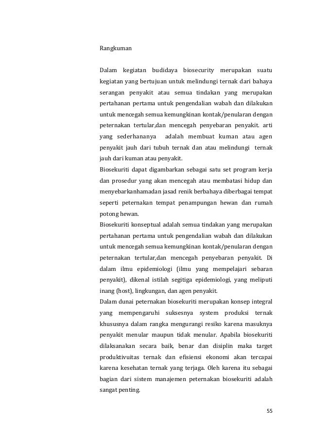 - 64. 55 Rangkuman Dalam kegiatan budidaya biosecurity merupakan suatu kegiatan yang bertujuan untuk melindungi ternak dari bahaya serangan penyakit atau semua tindakan yang merupakan pertahanan pertama untuk pengendalian wabah dan dilakukan untuk mencegah semua kemungkinan kontak/penularan dengan peternakan tertular,dan mencegah penyebaran penyakit. arti yang sederhananya adalah membuat kuman atau agen penyakit jauh dari tubuh ternak dan atau melindungi ternak jauh dari kuman atau penyakit. Biosekuriti dapat digambarkan sebagai satu set program kerja dan prosedur yang akan mencegah atau membatasi hidup dan menyebarkanhamadan jasad renik berbahaya diberbagai tempat seperti peternakan tempat penampungan hewan dan rumah potong hewan. Biosekuriti konseptual adalah semua tindakan yang merupakan pertahanan pertama untuk pengendalian wabah dan dilakukan untuk mencegah semua kemungkinan kontak/penularan dengan peternakan tertular,dan mencegah penyebaran penyakit. Di dalam ilmu epidemiologi (ilmu yang mempelajari sebaran penyakit), dikenal istilah segitiga epidemiologi, yang meliputi inang (host), lingkungan, dan agen penyakit. Dalam dunai peternakan biosekuriti merupakan konsep integral yang mempengaruhi suksesnya system produksi ternak khususnya dalam rangka mengurangi resiko karena masuknya penyakit menular maupun tidak menular. Apabila biosekuriti dilaksanakan secara baik, benar dan disiplin maka target produktivuitas ternak dan efisiensi ekonomi akan tercapai karena kesehatan ternak yang terjaga. Oleh karena itu sebagai bagian dari sistem manajemen peternakan biosekuriti adalah sangat penting.