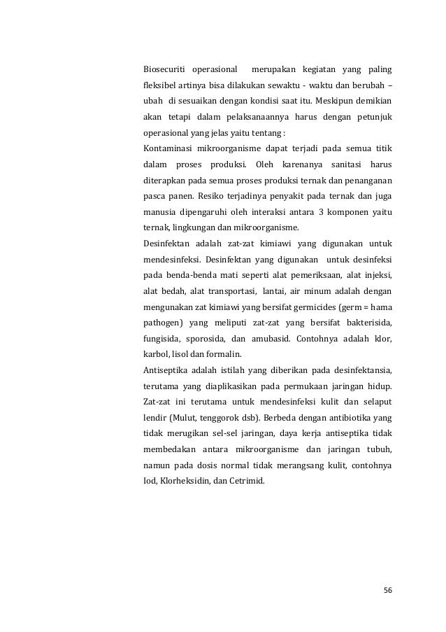 - 65. 56 Biosecuriti operasional merupakan kegiatan yang paling fleksibel artinya bisa dilakukan sewaktu - waktu dan berubah – ubah di sesuaikan dengan kondisi saat itu. Meskipun demikian akan tetapi dalam pelaksanaannya harus dengan petunjuk operasional yang jelas yaitu tentang : Kontaminasi mikroorganisme dapat terjadi pada semua titik dalam proses produksi. Oleh karenanya sanitasi harus diterapkan pada semua proses produksi ternak dan penanganan pasca panen. Resiko terjadinya penyakit pada ternak dan juga manusia dipengaruhi oleh interaksi antara 3 komponen yaitu ternak, lingkungan dan mikroorganisme. Desinfektan adalah zat-zat kimiawi yang digunakan untuk mendesinfeksi. Desinfektan yang digunakan untuk desinfeksi pada benda-benda mati seperti alat pemeriksaan, alat injeksi, alat bedah, alat transportasi, lantai, air minum adalah dengan mengunakan zat kimiawi yang bersifat germicides (germ = hama pathogen) yang meliputi zat-zat yang bersifat bakterisida, fungisida, sporosida, dan amubasid. Contohnya adalah klor, karbol, lisol dan formalin. Antiseptika adalah istilah yang diberikan pada desinfektansia, terutama yang diaplikasikan pada permukaan jaringan hidup. Zat-zat ini terutama untuk mendesinfeksi kulit dan selaput lendir (Mulut, tenggorok dsb). Berbeda dengan antibiotika yang tidak merugikan sel-sel jaringan, daya kerja antiseptika tidak membedakan antara mikroorganisme dan jaringan tubuh, namun pada dosis normal tidak merangsang kulit, contohnya Iod, Klorheksidin, dan Cetrimid.
