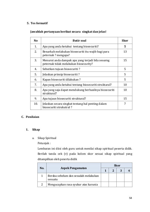 - 67. 58 5. Tes formatif Jawablah pertanyaan berikut secara singkat dan jelas! No Butir soal Skor 1. Apa yang anda ketahui tentang biosecuriti? 5 2. Benarkah melakukan biosecuriti itu wajib bagi para peternak ? mengapa? 13 3. Menurut anda dampak apa yang terjadi bila seoarng peternak tidak melakukan biosecurity? 15 4. Sebutkan tujuan biosecuriti ? 5 5. Jelaskan prinsip biosecuriti ? 5 6. Kapan biosecuriti dilakukan ? 5 7. Apa yang anda ketahui tentang biosecuriti struktaral? 10 8. Apa yang saja dapat mendukung berhasilnya biosecuriti struktural? 10 9. Apa tujaun biosecuriti struktural? 15 10. Jelaskan secara singkat tentang hal penting dalam biosecuriti strukutral ? 7 C. Penilaian 1. Sikap a. Sikap Spiritual Petunjuk : Lembaran ini diisi oleh guru untuk menilai sikap spiritual peserta didik. Berilah tanda cek (v) pada kolom skor sesuai sikap spiritual yang ditampilkan oleh peserta didik No. Aspek Pengamatan Skor 1 2 3 4 1 Berdoa sebelum dan sesudah melakukan sesuatu 2 Mengucapkan rasa syukur atas karunia