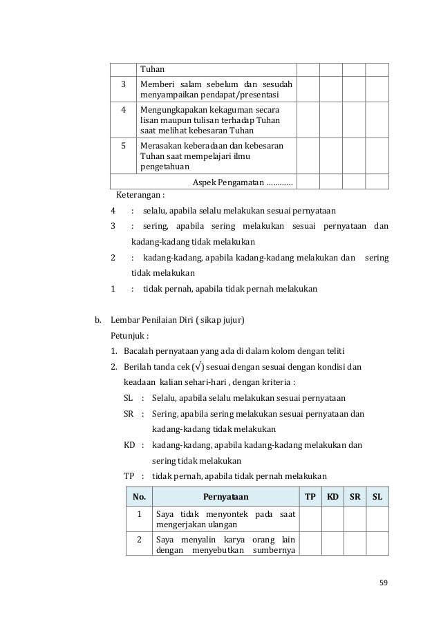 - 68. 59 Tuhan 3 Memberi salam sebelum dan sesudah menyampaikan pendapat/presentasi 4 Mengungkapakan kekaguman secara lisan maupun tulisan terhadap Tuhan saat melihat kebesaran Tuhan 5 Merasakan keberadaan dan kebesaran Tuhan saat mempelajari ilmu pengetahuan Aspek Pengamatan ………… Keterangan : 4 : selalu, apabila selalu melakukan sesuai pernyataan 3 : sering, apabila sering melakukan sesuai pernyataan dan kadang-kadang tidak melakukan 2 : kadang-kadang, apabila kadang-kadang melakukan dan sering tidak melakukan 1 : tidak pernah, apabila tidak pernah melakukan b. Lembar Penilaian Diri ( sikap jujur) Petunjuk : 1. Bacalah pernyataan yang ada di dalam kolom dengan teliti 2. Berilah tanda cek (√) sesuai dengan sesuai dengan kondisi dan keadaan kalian sehari-hari , dengan kriteria : SL : Selalu, apabila selalu melakukan sesuai pernyataan SR : Sering, apabila sering melakukan sesuai pernyataan dan kadang-kadang tidak melakukan KD : kadang-kadang, apabila kadang-kadang melakukan dan sering tidak melakukan TP : tidak pernah, apabila tidak pernah melakukan No. Pernyataan TP KD SR SL 1 Saya tidak menyontek pada saat mengerjakan ulangan 2 Saya menyalin karya orang lain dengan menyebutkan sumbernya