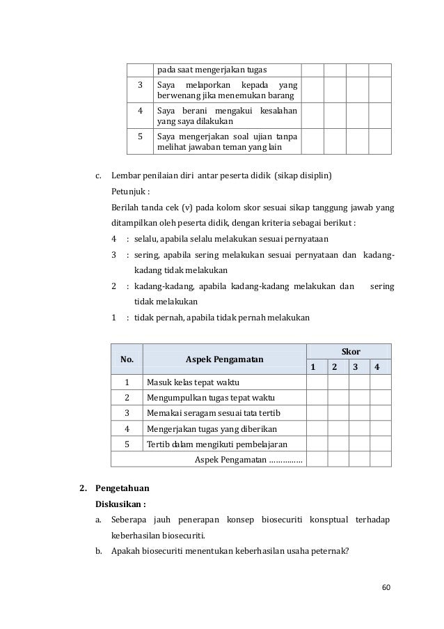 - 69. 60 pada saat mengerjakan tugas 3 Saya melaporkan kepada yang berwenang jika menemukan barang 4 Saya berani mengakui kesalahan yang saya dilakukan 5 Saya mengerjakan soal ujian tanpa melihat jawaban teman yang lain c. Lembar penilaian diri antar peserta didik (sikap disiplin) Petunjuk : Berilah tanda cek (v) pada kolom skor sesuai sikap tanggung jawab yang ditampilkan oleh peserta didik, dengan kriteria sebagai berikut : 4 : selalu, apabila selalu melakukan sesuai pernyataan 3 : sering, apabila sering melakukan sesuai pernyataan dan kadang- kadang tidak melakukan 2 : kadang-kadang, apabila kadang-kadang melakukan dan sering tidak melakukan 1 : tidak pernah, apabila tidak pernah melakukan No. Aspek Pengamatan Skor 1 2 3 4 1 Masuk kelas tepat waktu 2 Mengumpulkan tugas tepat waktu 3 Memakai seragam sesuai tata tertib 4 Mengerjakan tugas yang diberikan 5 Tertib dalam mengikuti pembelajaran Aspek Pengamatan …………… 2. Pengetahuan Diskusikan : a. Seberapa jauh penerapan konsep biosecuriti konsptual terhadap keberhasilan biosecuriti. b. Apakah biosecuriti menentukan keberhasilan usaha peternak?