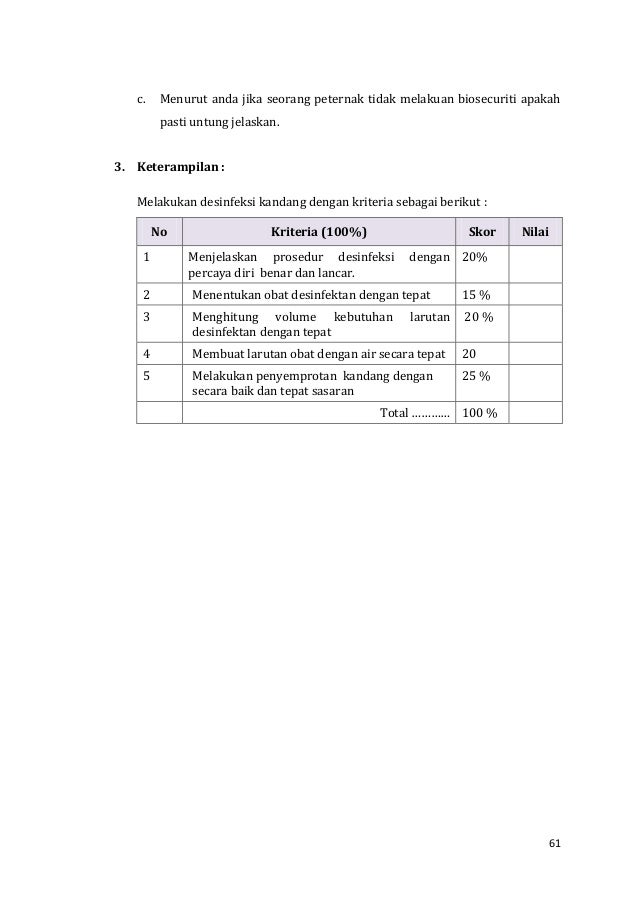 - 70. 61 c. Menurut anda jika seorang peternak tidak melakuan biosecuriti apakah pasti untung jelaskan. 3. Keterampilan : Melakukan desinfeksi kandang dengan kriteria sebagai berikut : No Kriteria (100%) Skor Nilai 1 Menjelaskan prosedur desinfeksi dengan percaya diri benar dan lancar. 20% 2 Menentukan obat desinfektan dengan tepat 15 % 3 Menghitung volume kebutuhan larutan desinfektan dengan tepat 20 % 4 Membuat larutan obat dengan air secara tepat 20 5 Melakukan penyemprotan kandang dengan secara baik dan tepat sasaran 25 % Total ………… 100 %